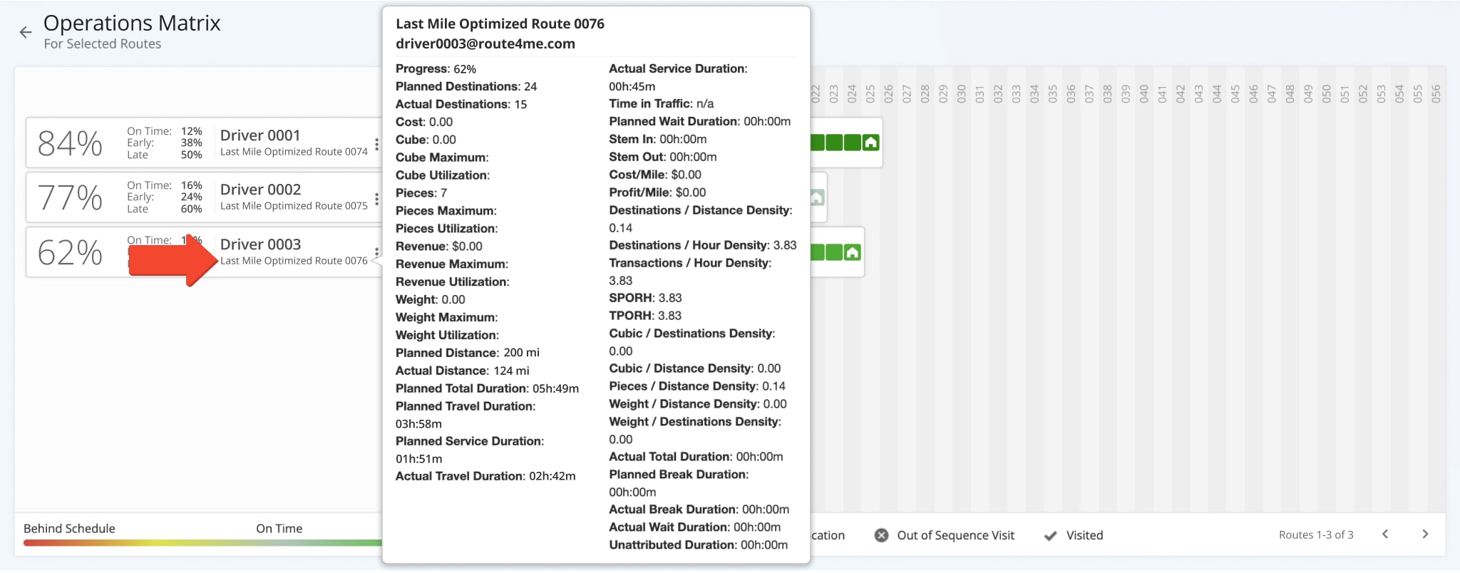 You can also see a full breakdown of a route’s planned and current information. Simply hover over a route’s name to see a summary of all its key metrics, schedule details, order information, and more.