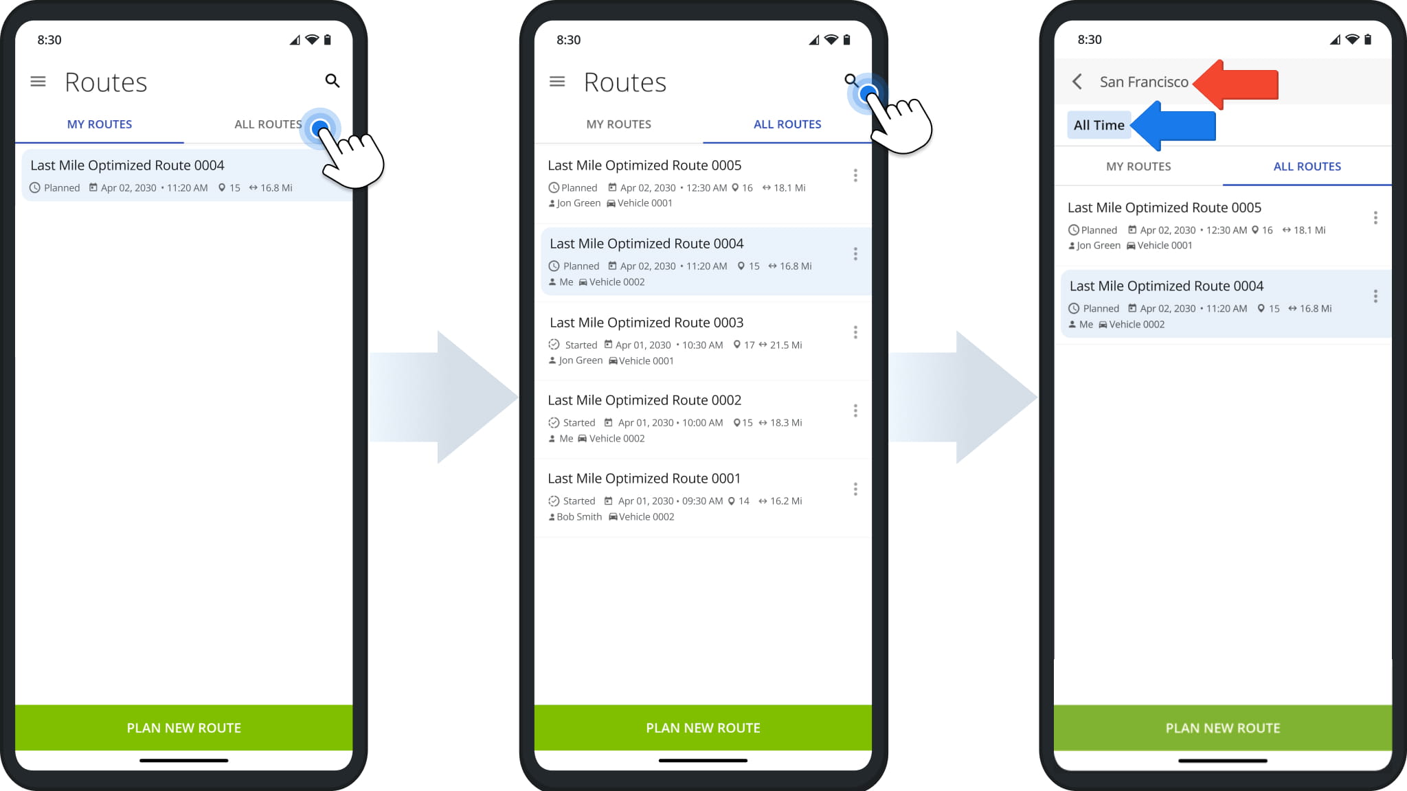 Simply tap “All Routes” to access the full Routes List. You can also tap the Search Icon to find routes by name, scheduled month, city, or other attributes. To filter the Routes List by date, click the button under the Search Field.