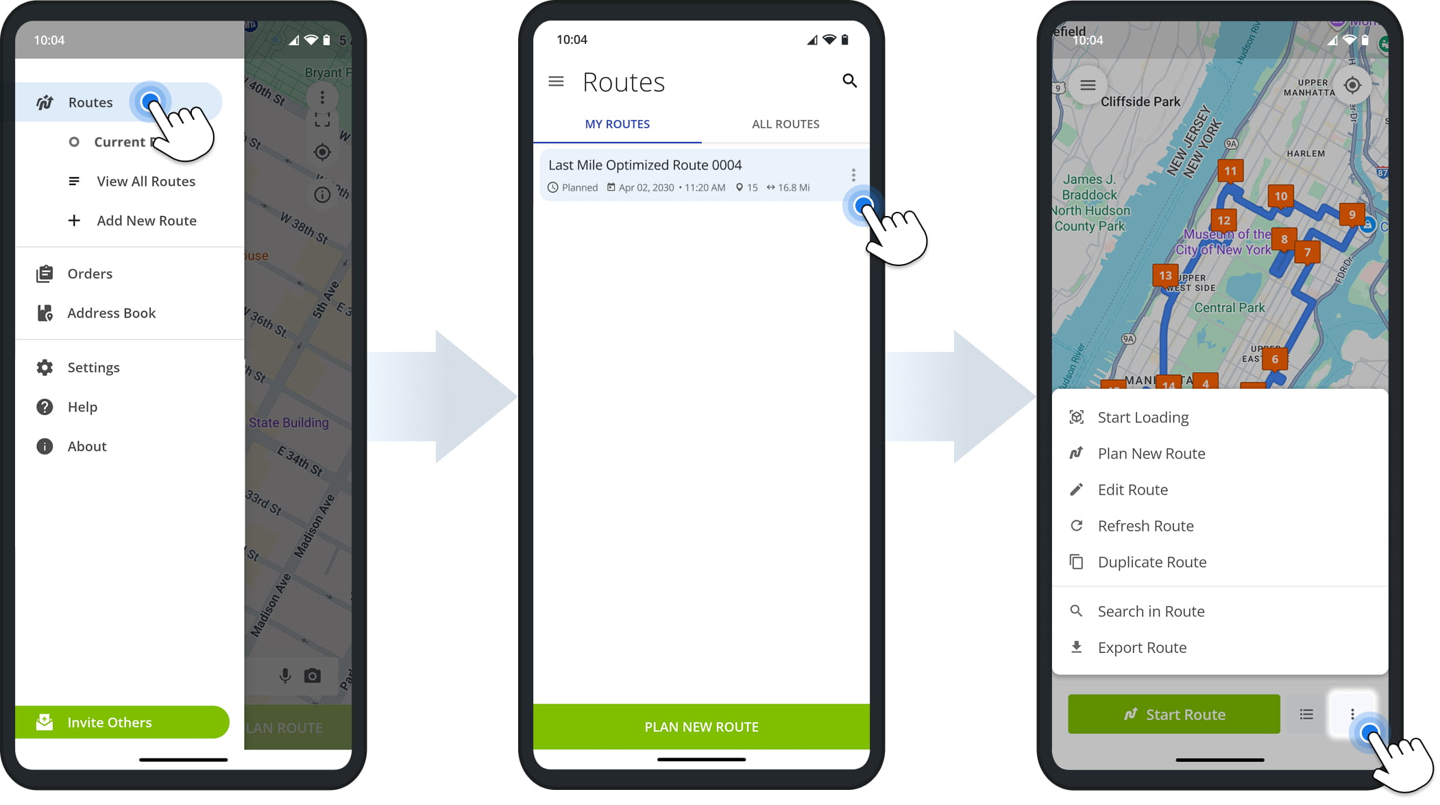 Mobile route management is easy with the Route4Me Mobile Route Planner App. Basic route actions are available right from the Routes List. Go to “Routes“, tap the Three-dot Icon next to a route to see your available actions.