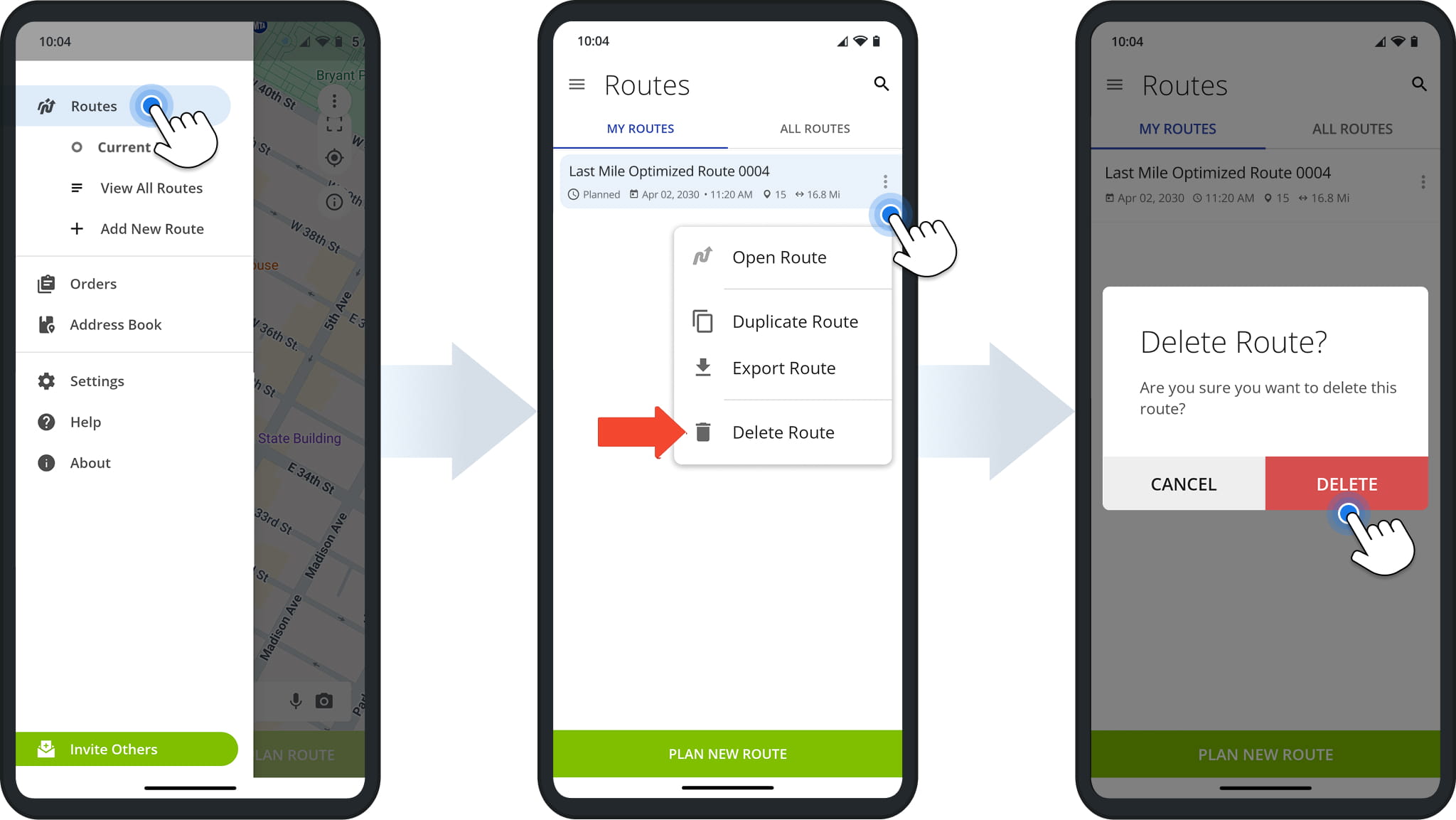 To remove a route, go to a “Routes” from the main menu, tap the Three-dot Icon next to the route you want to delete, and select “Delete Route“. Confirm by tapping “Delete” when prompted.