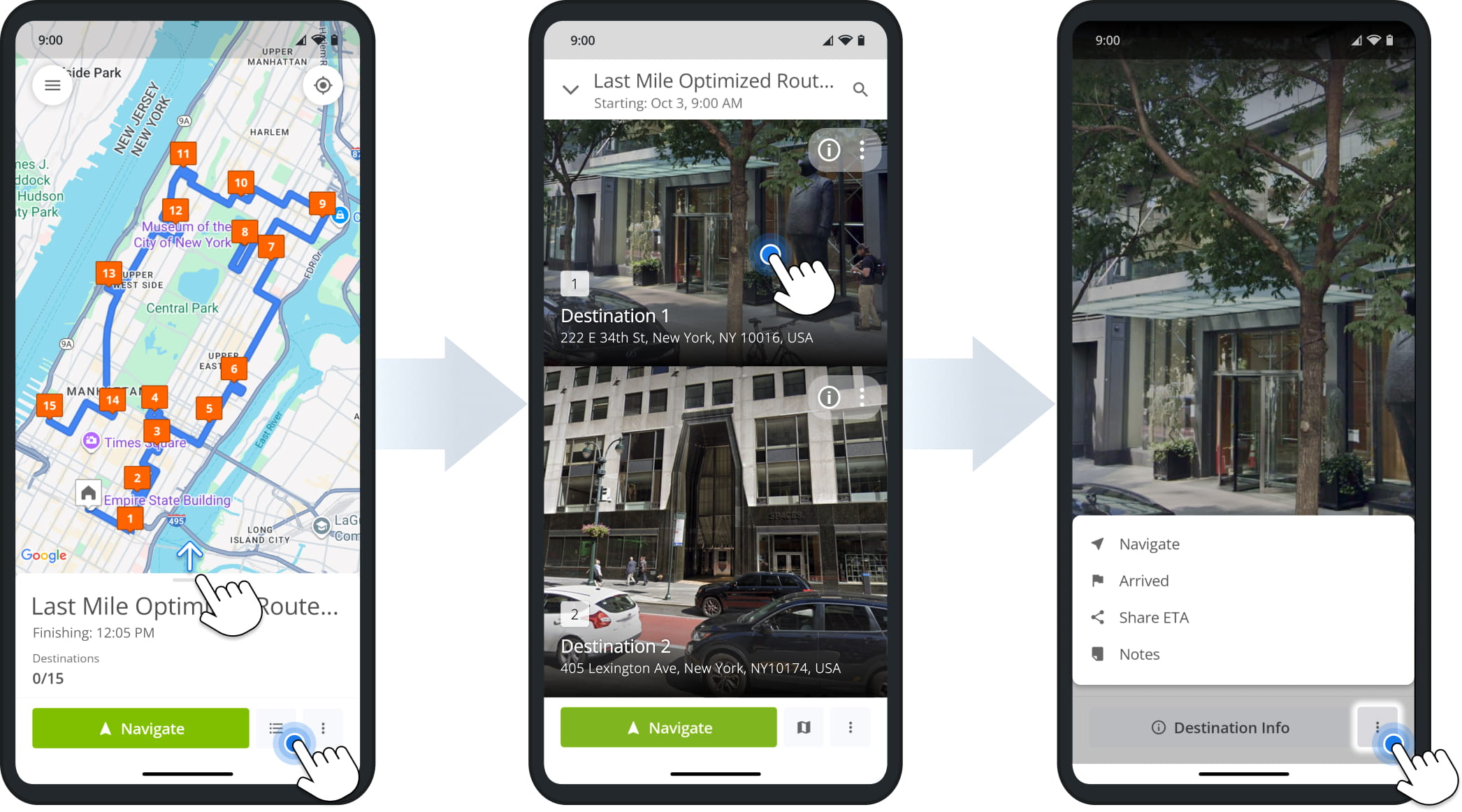 Mobile destination management is easy with the Route4Me Mobile Route Planner App. You can access basic destination actions from the Destinations List for started routes. To do so, on the route screen, swipe up or tap the List Button in the bottom-right. Then, tap a destination to open it and tap the Three-dot Button in the bottom-right.