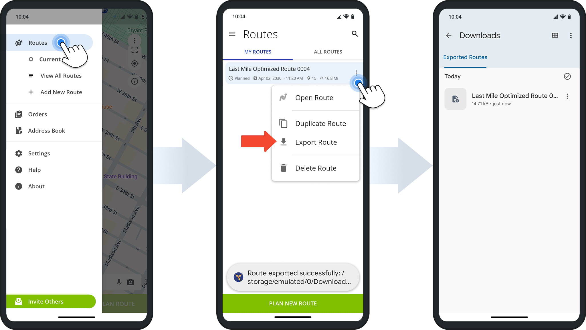 To download a CSV file with the route’s destinations and their associated data, go to “Routes” from the main menu. Then, tap the Three-dot Icon next to the route you want to download, and select “Export Route” from the menu.