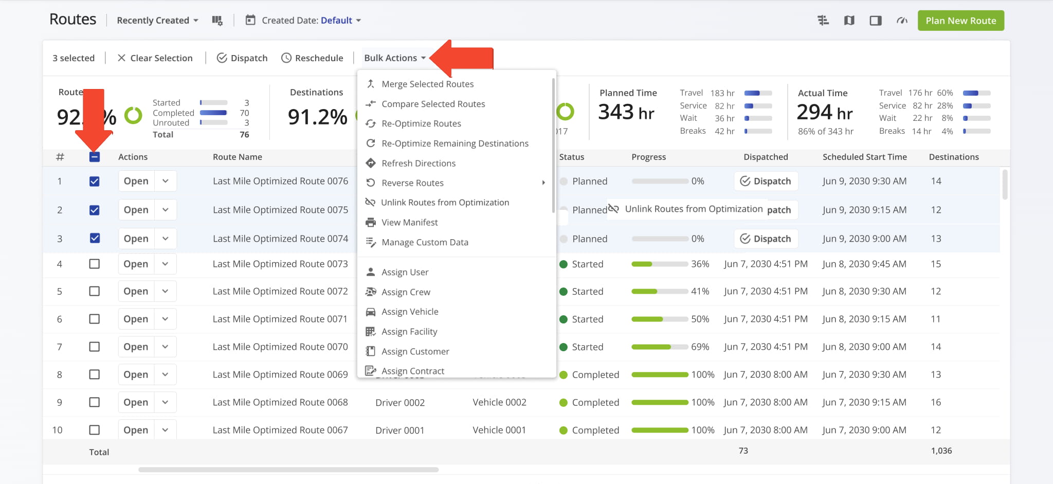 Select “Unlink Routes from Optimization” to remove selected routes from their current optimization. This lets you freely adjust stops, sequence, and assignments without being constrained by previous settings.