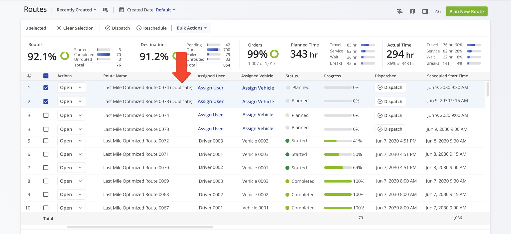 Select “Duplicate” to create copies of one or more routes, with “(Duplicate)” added to the new route names. This allows you to make changes or reassign routes without altering the originals.