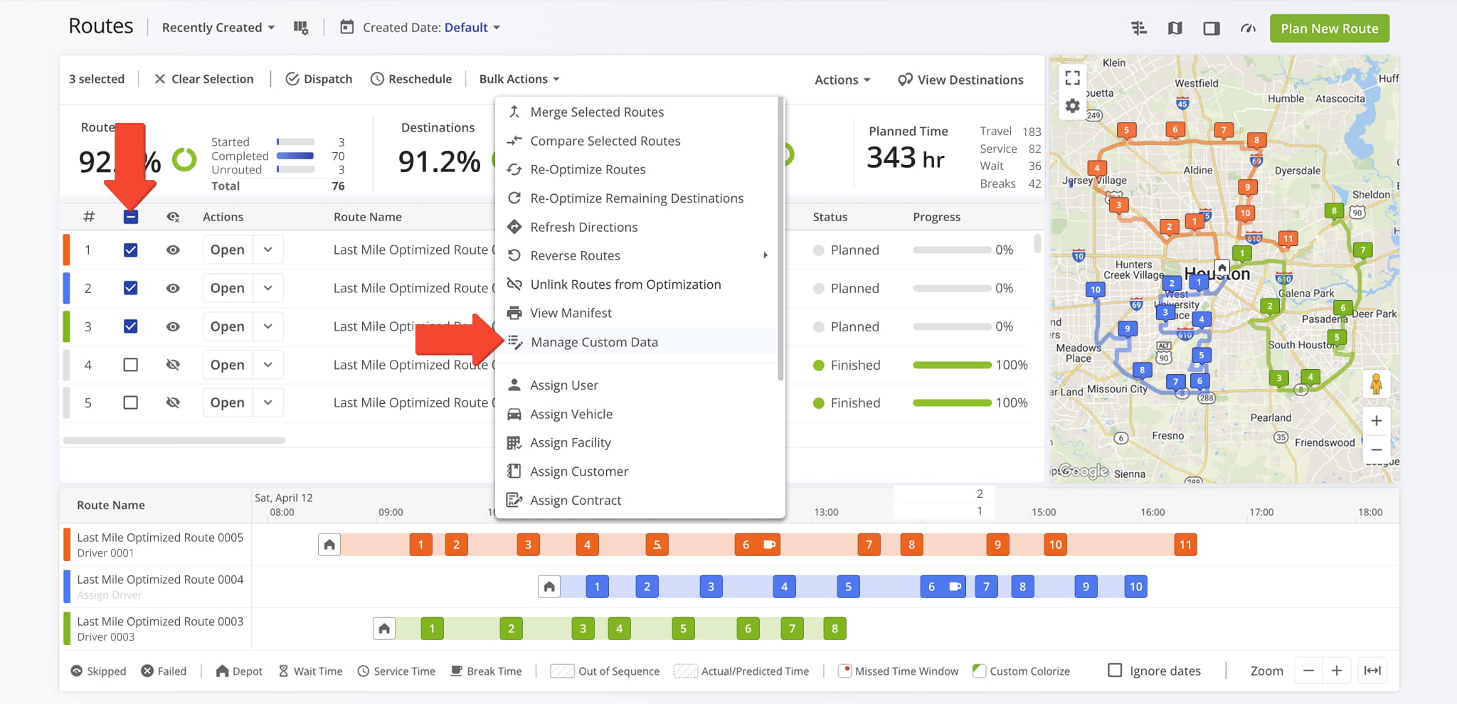 Select “Manage Custom Data” to view, add, or edit user-defined fields for selected routes. This allows you to attach extra operational details or notes that go beyond the standard route information.