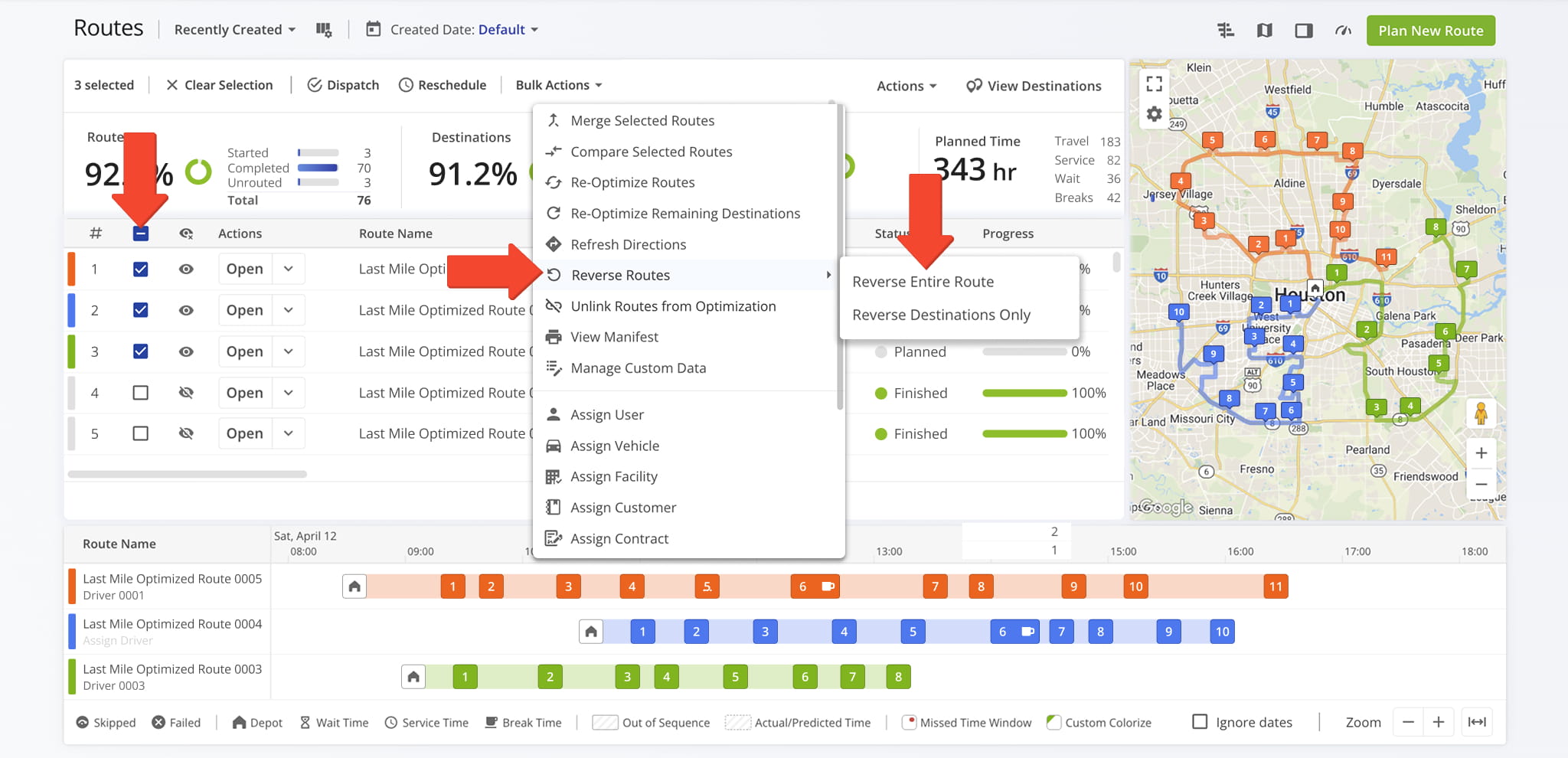 Select “Reverse Routes” to flip the order of stops and directions for a route. You can reverse the entire route, including start and end points, or just the destinations. When reversing a Round Trip route, the scheduled start and end points remain as is.
