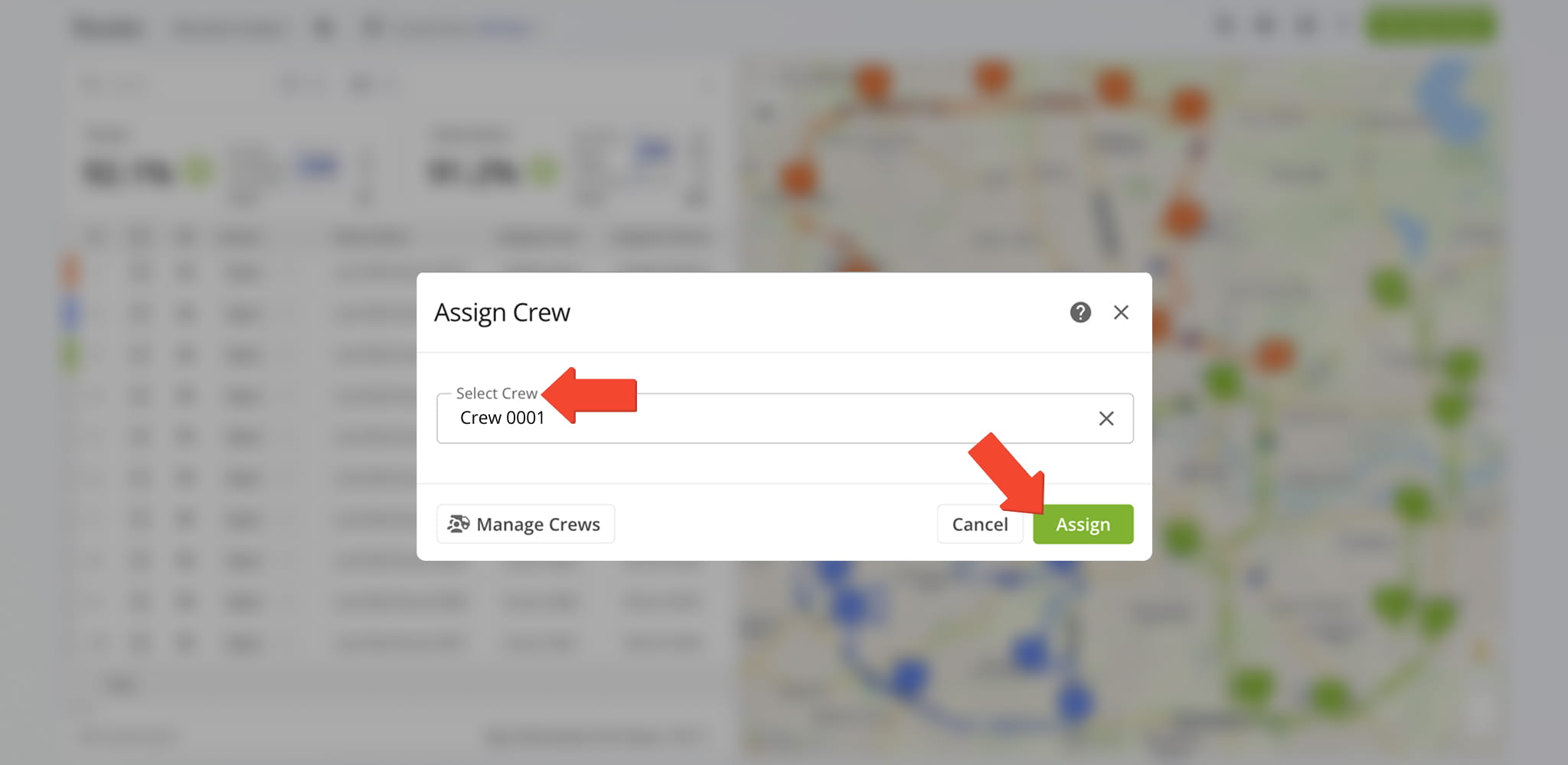 Select “Assign Crew” to assign a crew to selected routes. Crews group multiple users, such as drivers or field team members, into a single unit for coordinated route execution.