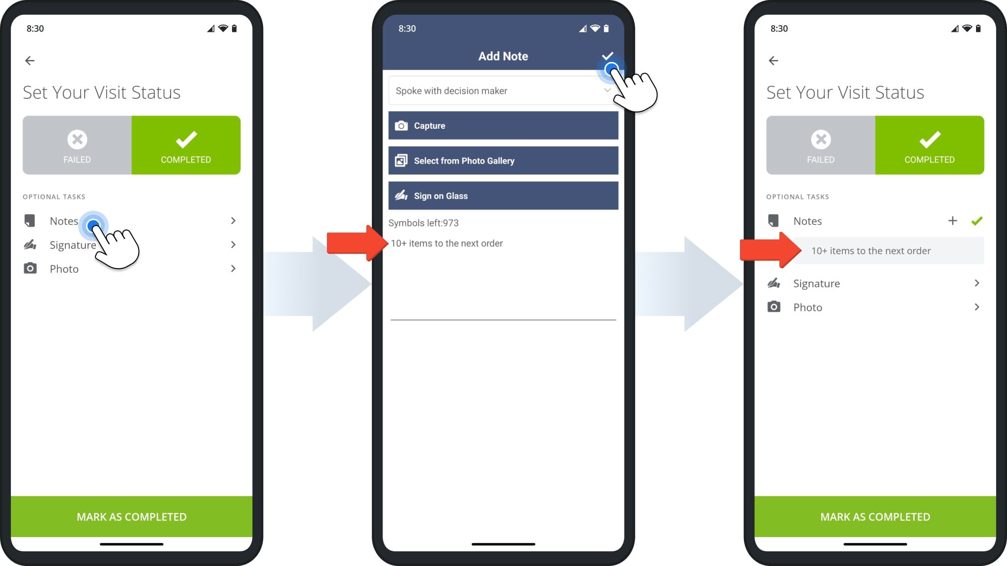 To add a Text Note, tap “Notes“, enter your text, and tap the checkmark to save. You can also attach images or signatures to a note. Use notes to record additional order details, next steps, or instructions.