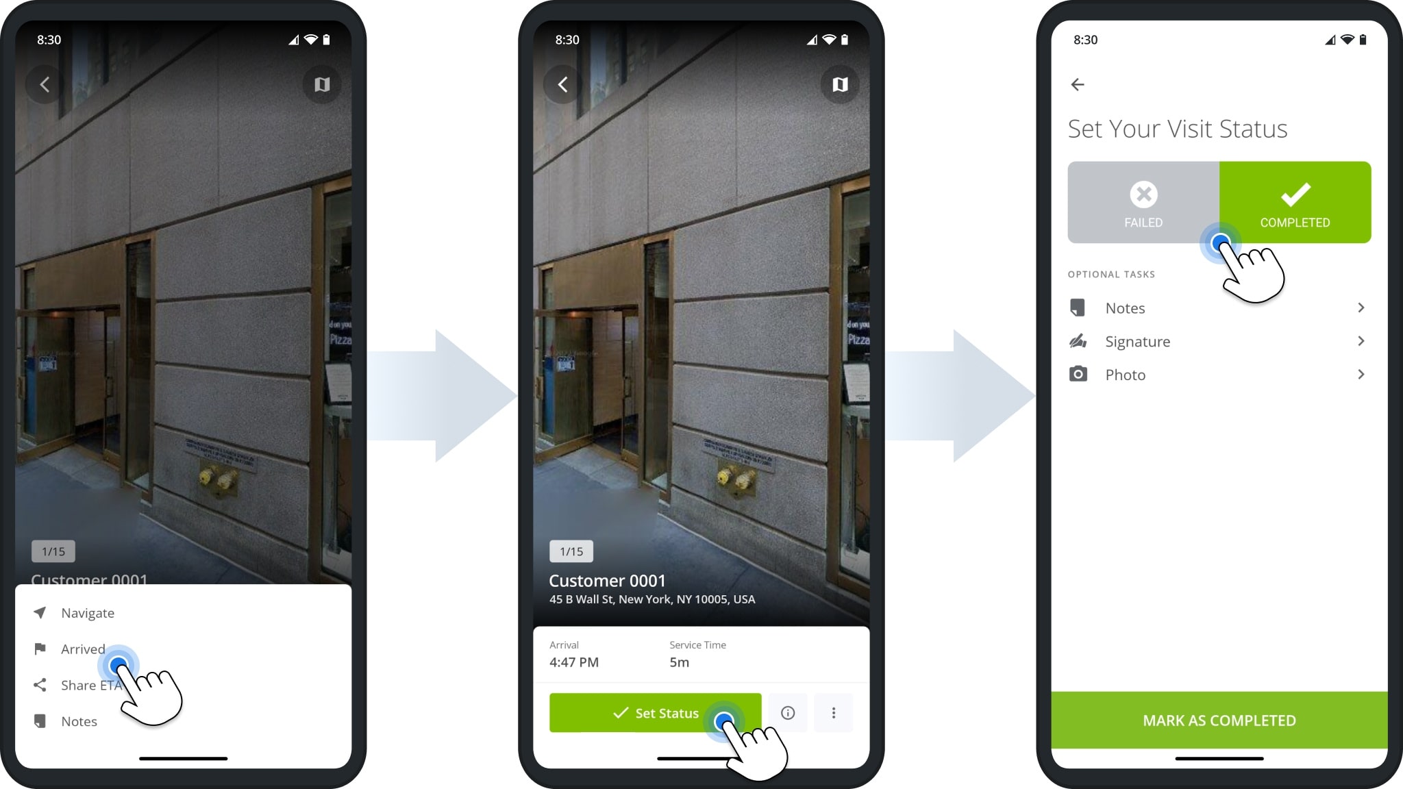 Set statuses to route stops and addresses on Android Multi-Stop Route Optimization app for last-mile drivers to track route progress.