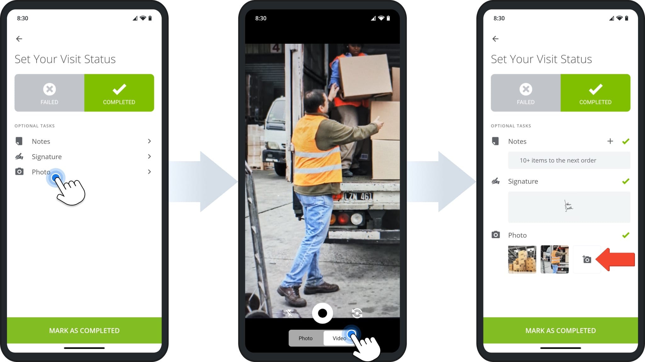 Attach proof of visit, delivery, or service to route stops on the Android Route Planner app: electronic signatures, photos, videos, and text notes.