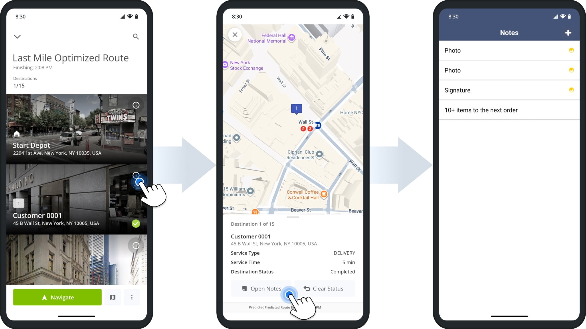 To review attached proof of service, visit, or delivery, tap the Information Icon next to a stop, then tap “Open Notes“. On the stop’s “Notes” screen, you can view all attached images, videos, text notes, and signatures.