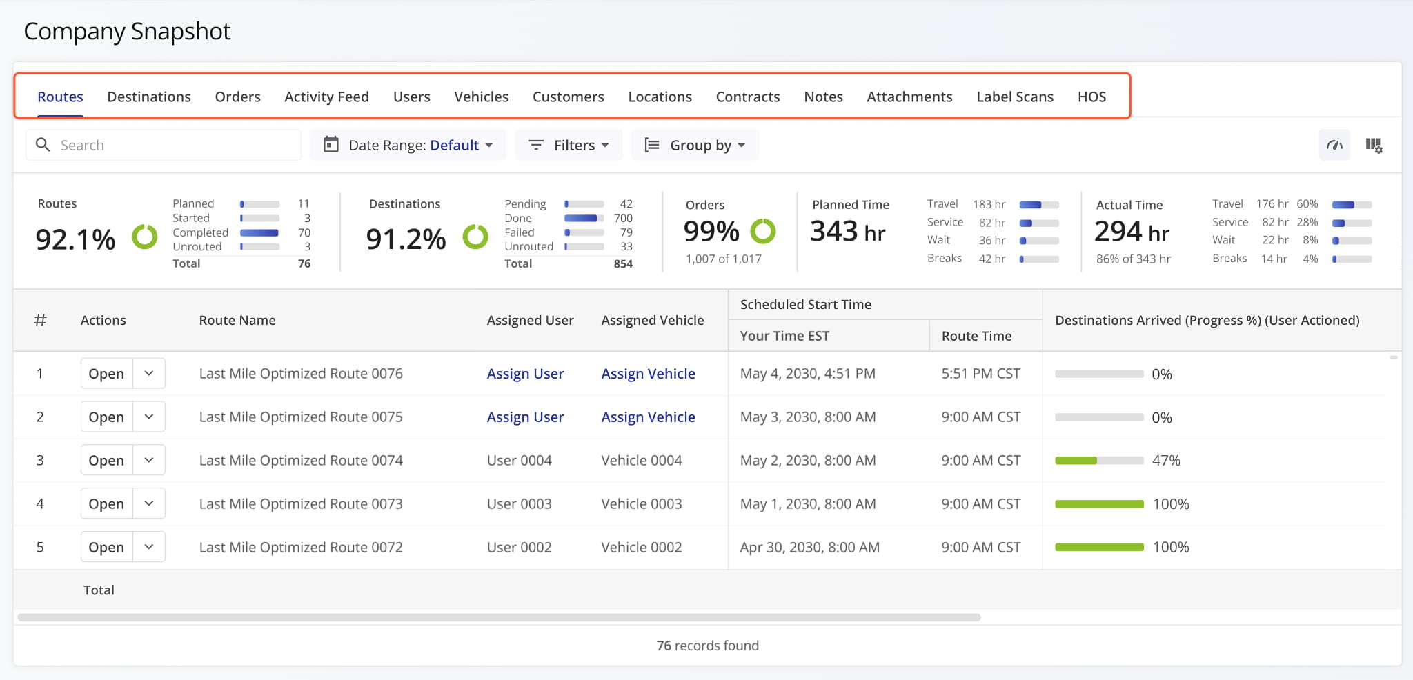 | Routes | View and manage all routes, including planning, optimization, and performance details. |