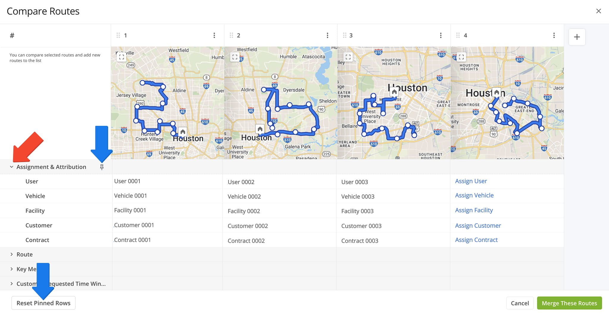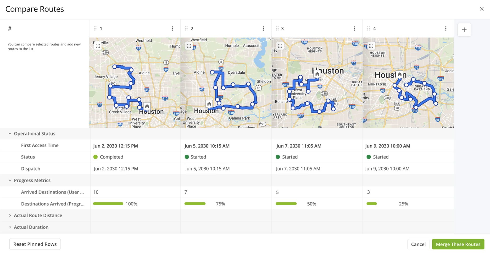 You can compare routes using operational status, progress metrics, and other real-time indicators. These fields update automatically as routes change, giving you an always-current view of performance.