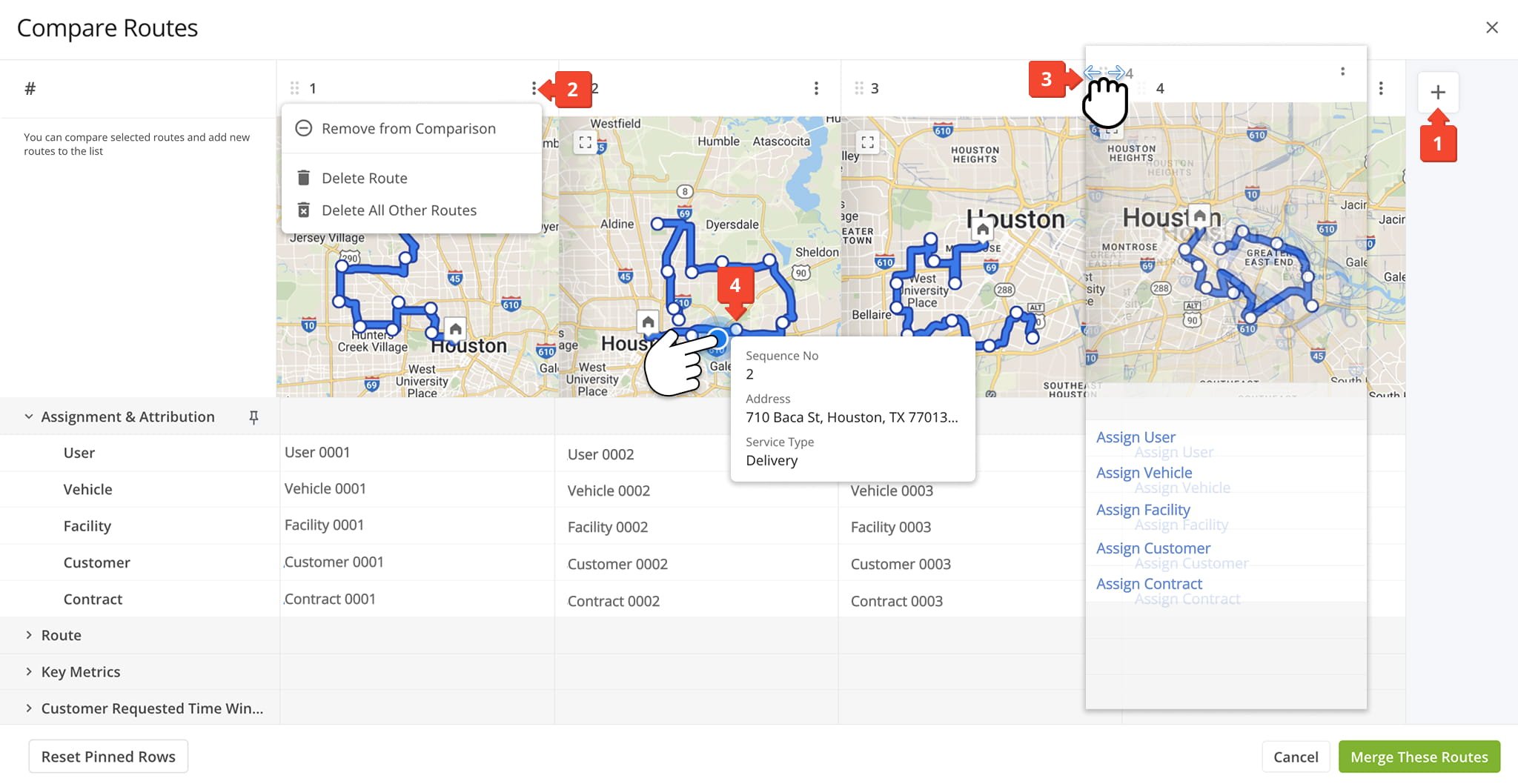After you open a route comparison with several routes, you can click the “Merge These Routes” button to merge them into a single, combined route with a new, optimized destination sequence and directions.