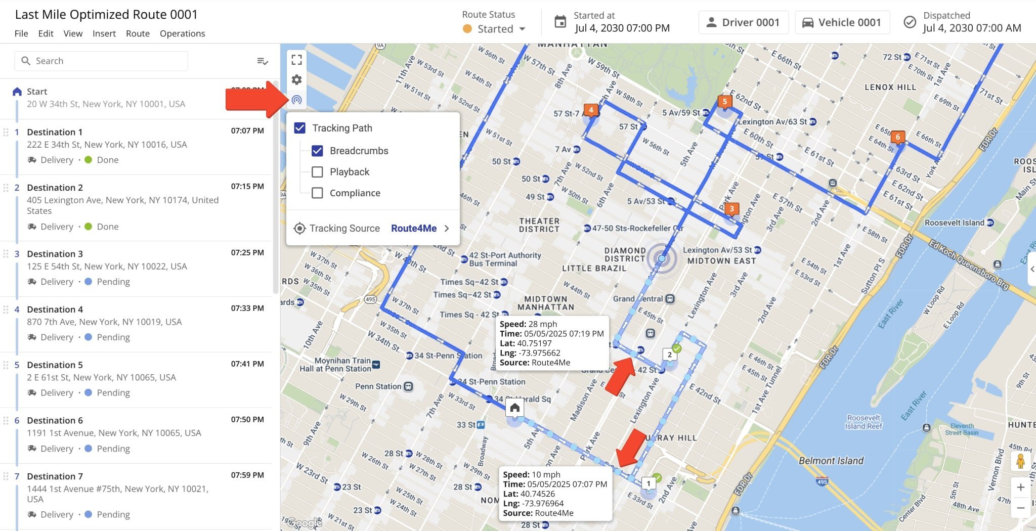 Our GPS tracking system enables you to track the exact location of drivers, vehicles, and assets on routes. See where your drivers are and where they’ve been with detailed tracking history, GPS distance, tracking update breadcrumbs, simulate routes before they start, view tracking history playbacks, and more.
