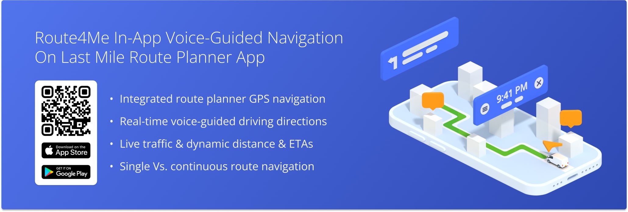 Route4Me’s Multi Stop Route Planner app provides seamless continuity for users and drivers as they navigate and complete routes. The app supports integrated GPS navigation, allowing you to easily navigate your dispatched routes without switching between different apps. Specifically, in-app navigation supports voice-guided driving directions for driver safety, walking and bicycling directions, adjustable 3D maps, dynamic ETAs, live traffic, and more.