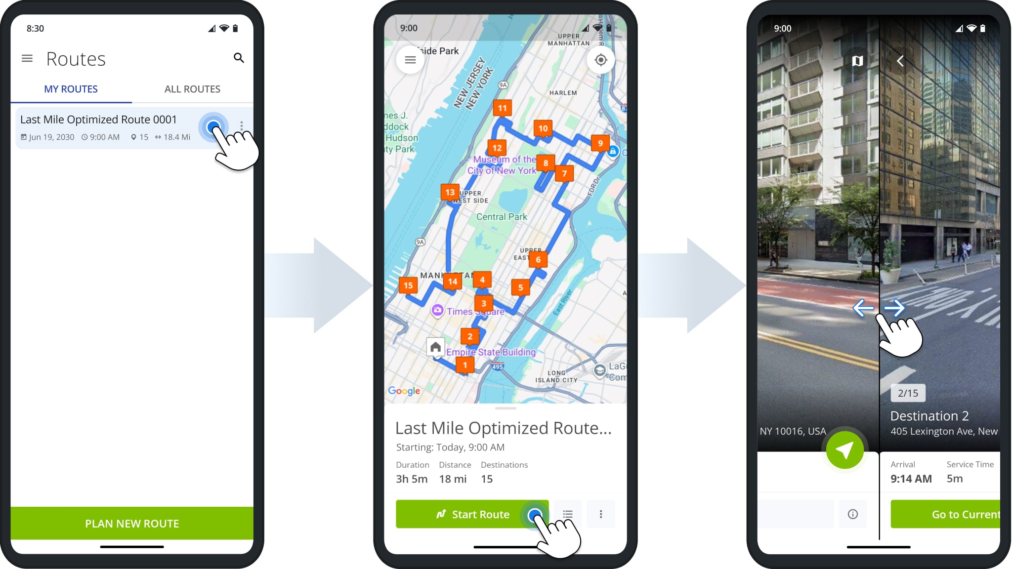 NOTE: When opening an already started route, “Start Route” is replaced with “Navigate“.
