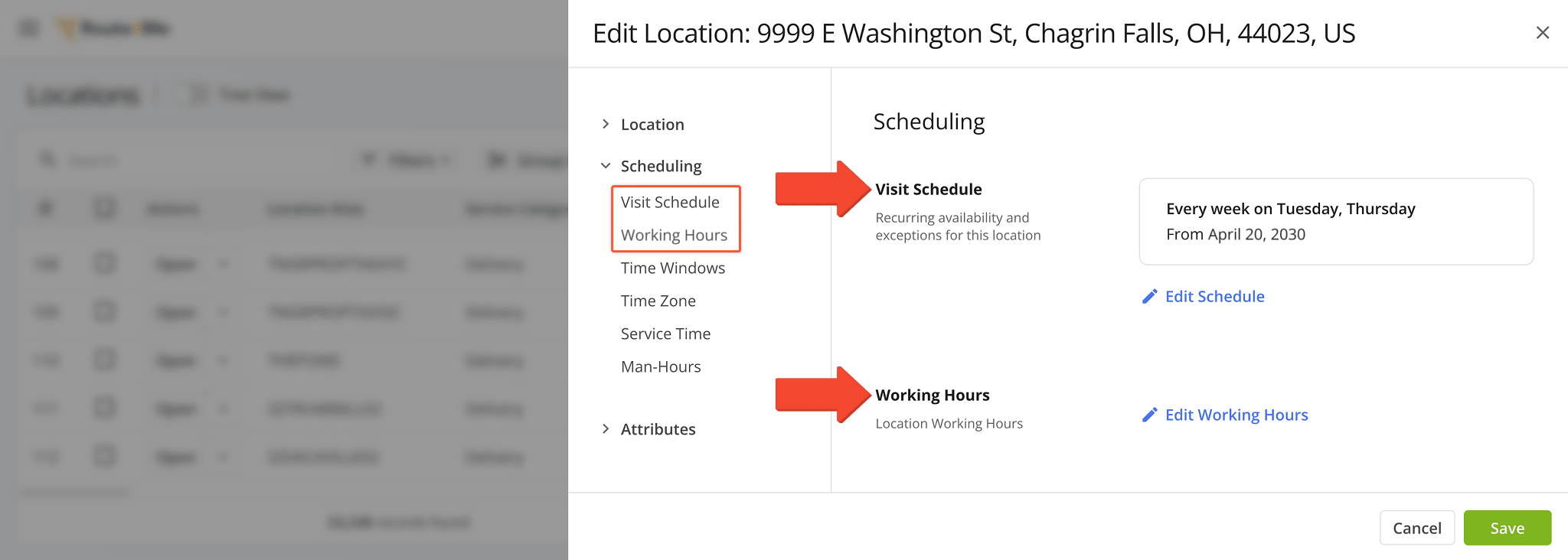 You can add schedules when creating and editing Locations. Use the “Visit Schedule” and “Working Hours” fields to add visit days, business hours, and other data to Locations you want to use for Strategic Optimizations.