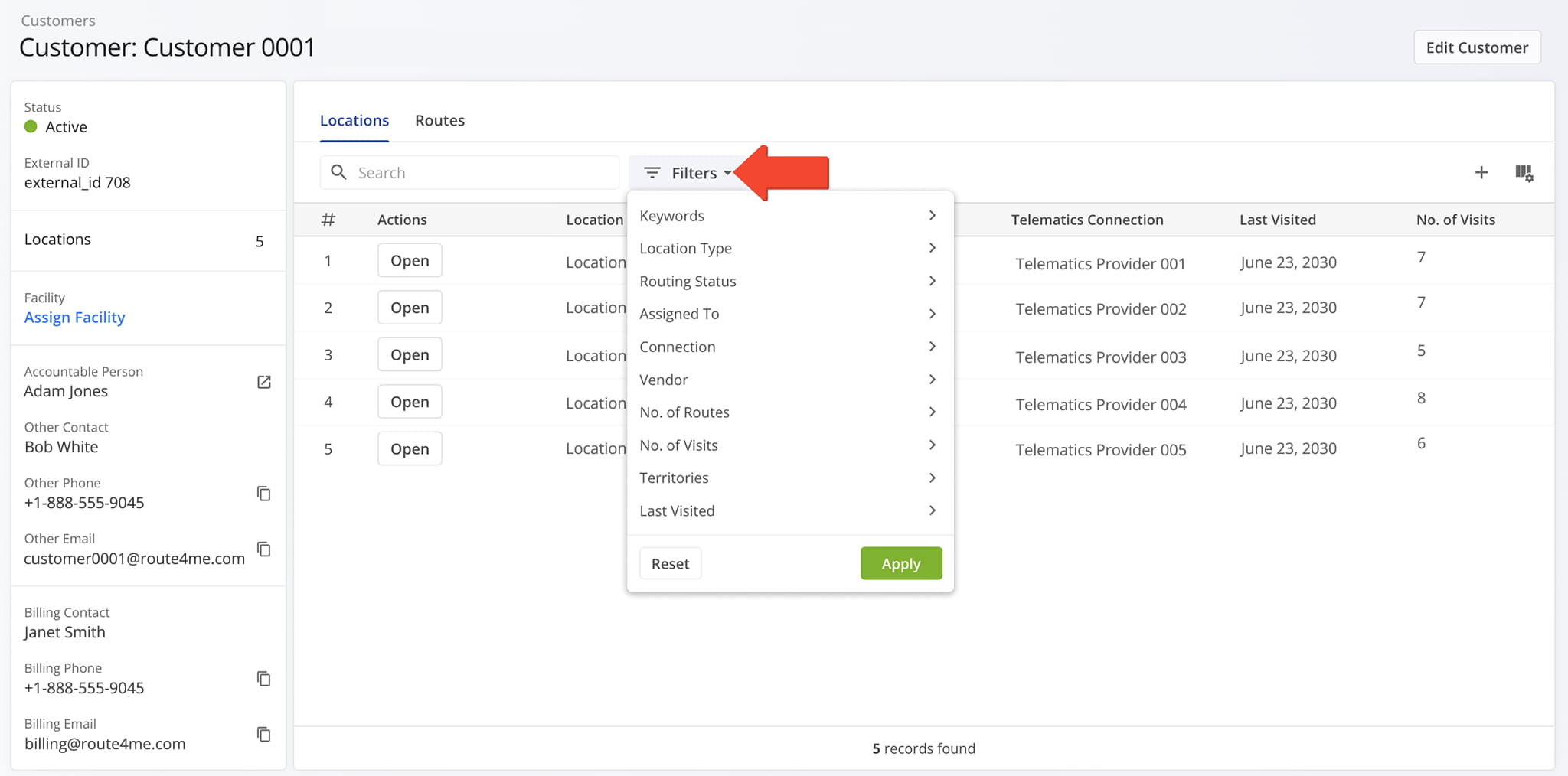 - Customer Tabs: Switch between “Locations” and “Routes” to explore Customer data which you can filter and customize as needed.