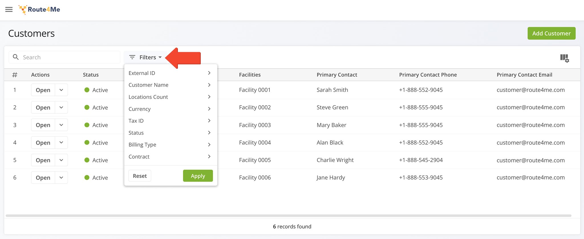 | External ID | Filter by a unique identifier assigned to the Customer via Route4Me or an external system such as a CRM or an ERP. |