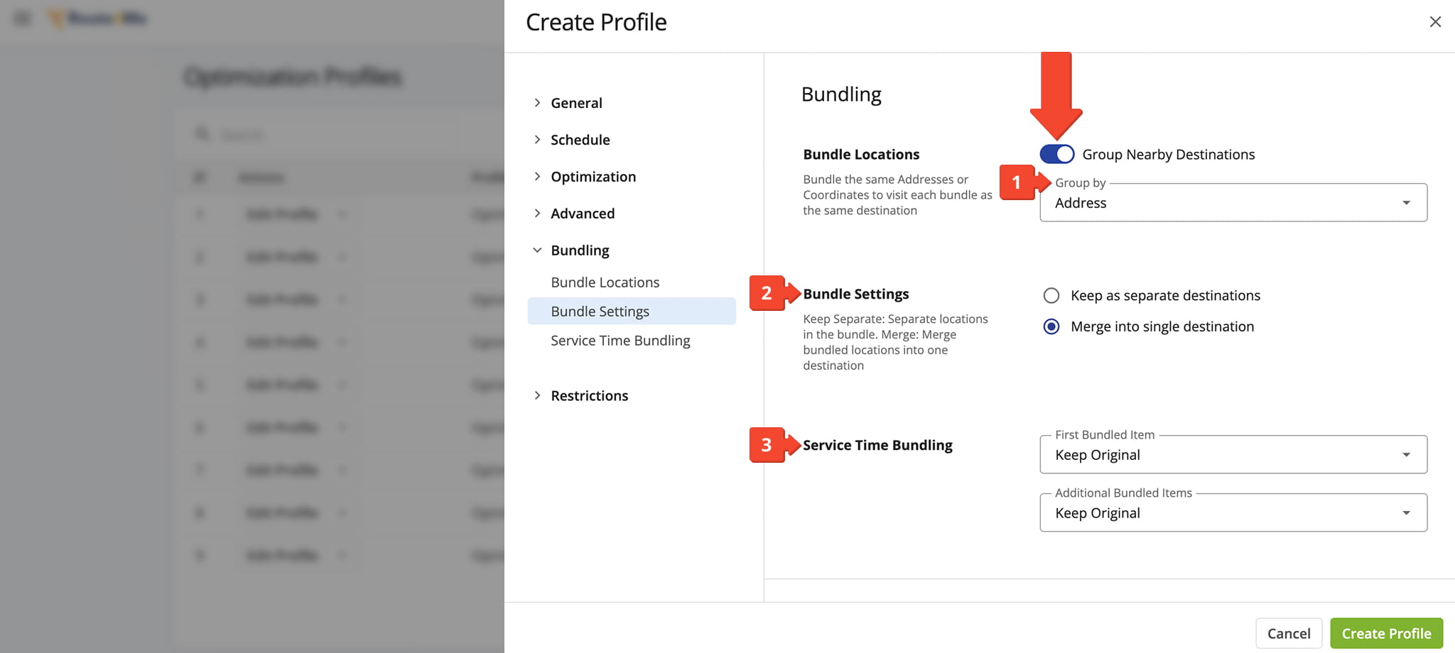 You can also bundle destinations when creating or editing Optimization Profiles. To access your Optimization Profiles, go to “Optimization Settings” > “Optimization Profiles” in the Navigation Menu. From the Profile editor panel, click “Bundle Locations” under the “Bundling” tab.