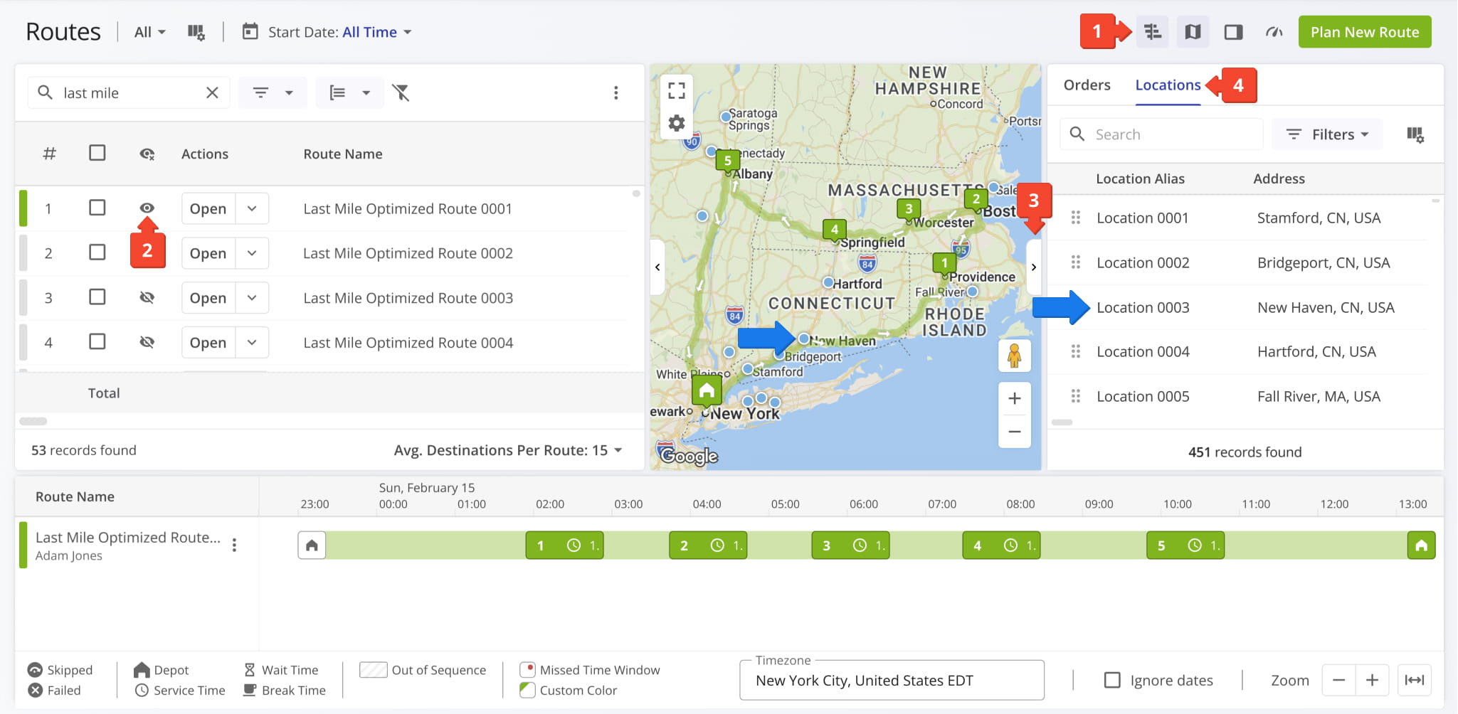 - Open the Routes Timeline and Routes Map with the buttons in the top-right.