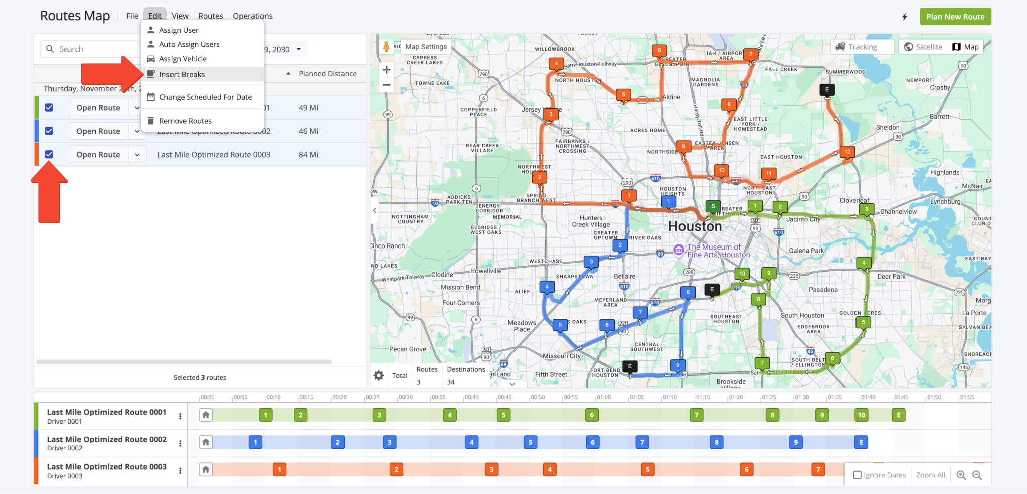 To insert breaks from the classic Routes Map, select the routes you want, then click “Edit” in the top menu and choose “Insert Breaks” from the dropdown menu.