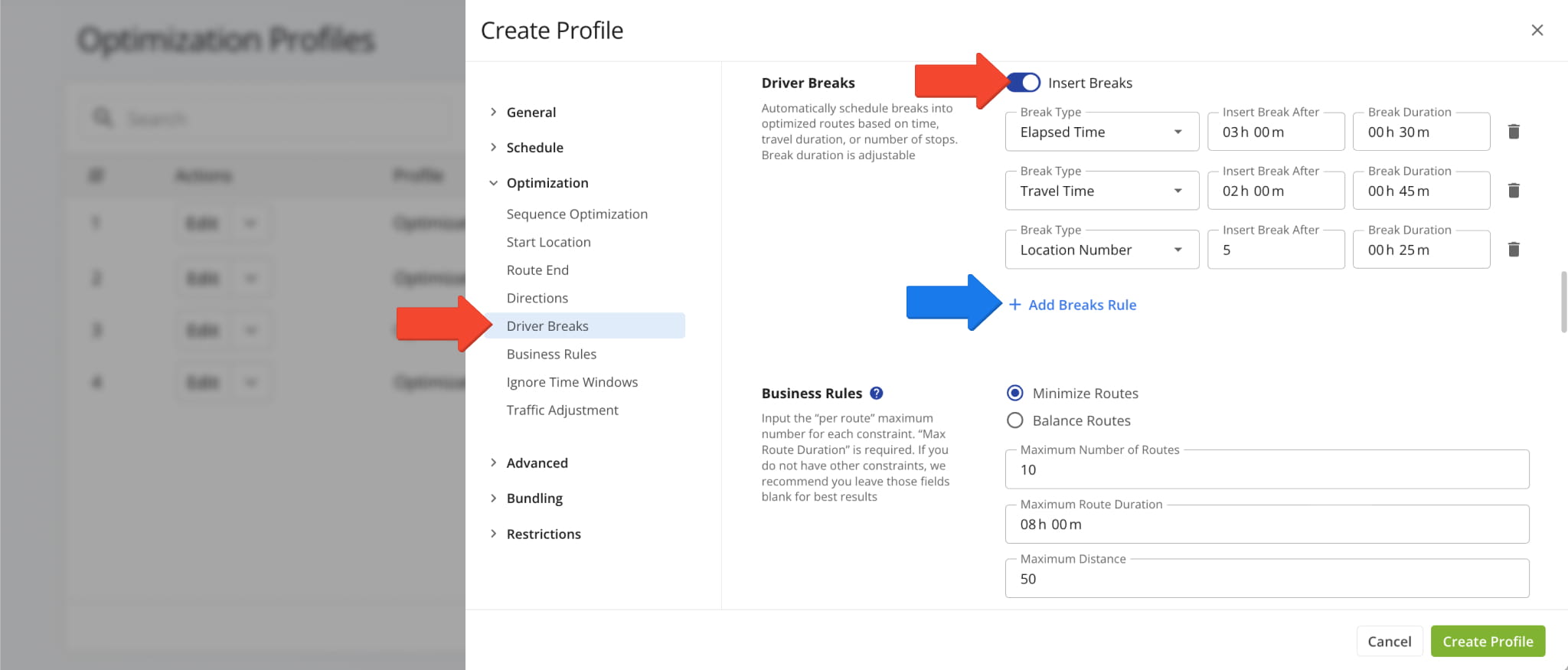 Then, from the “Optimization” section, open the “Driver Breaks” setting and toggle “Insert Breaks” to automatically add Driver Breaks to the selected Optimization Profile.