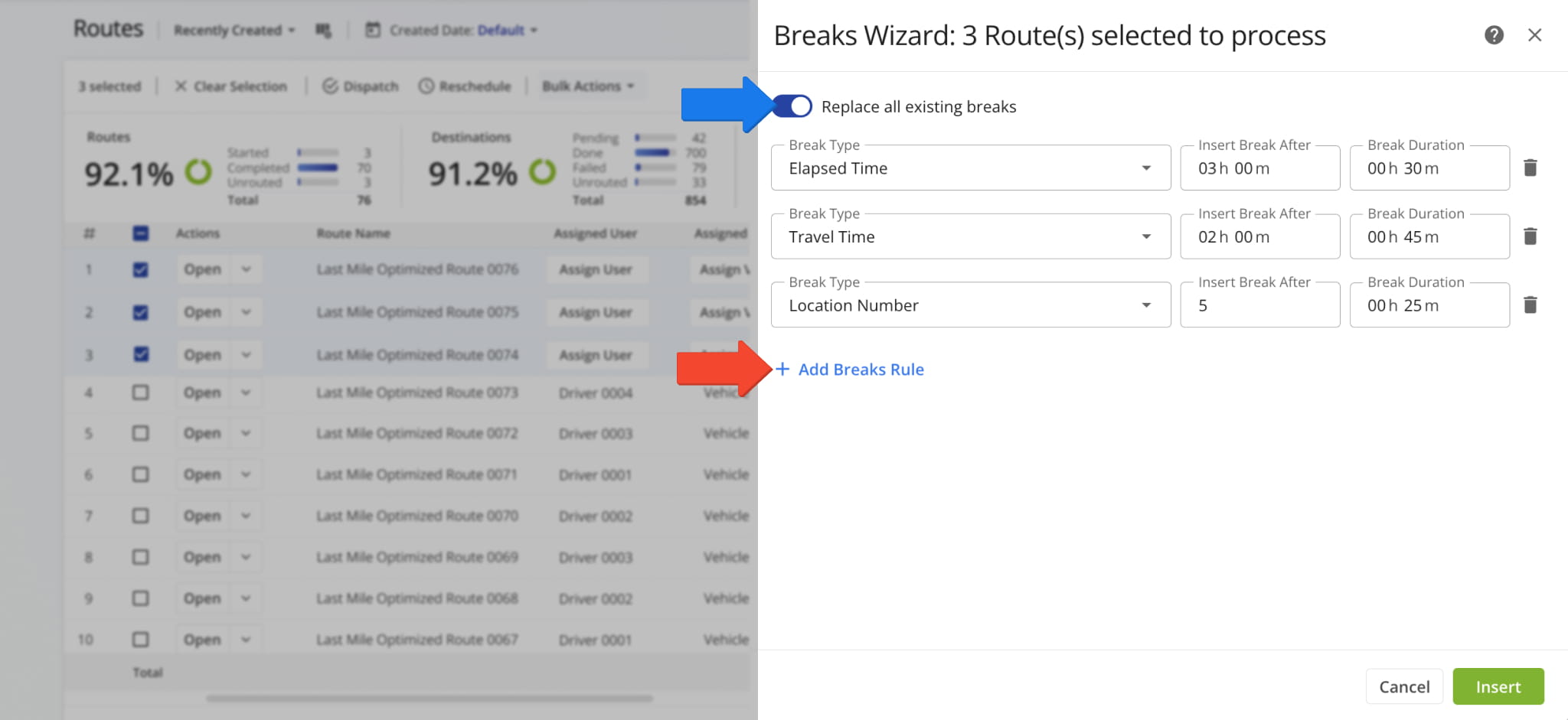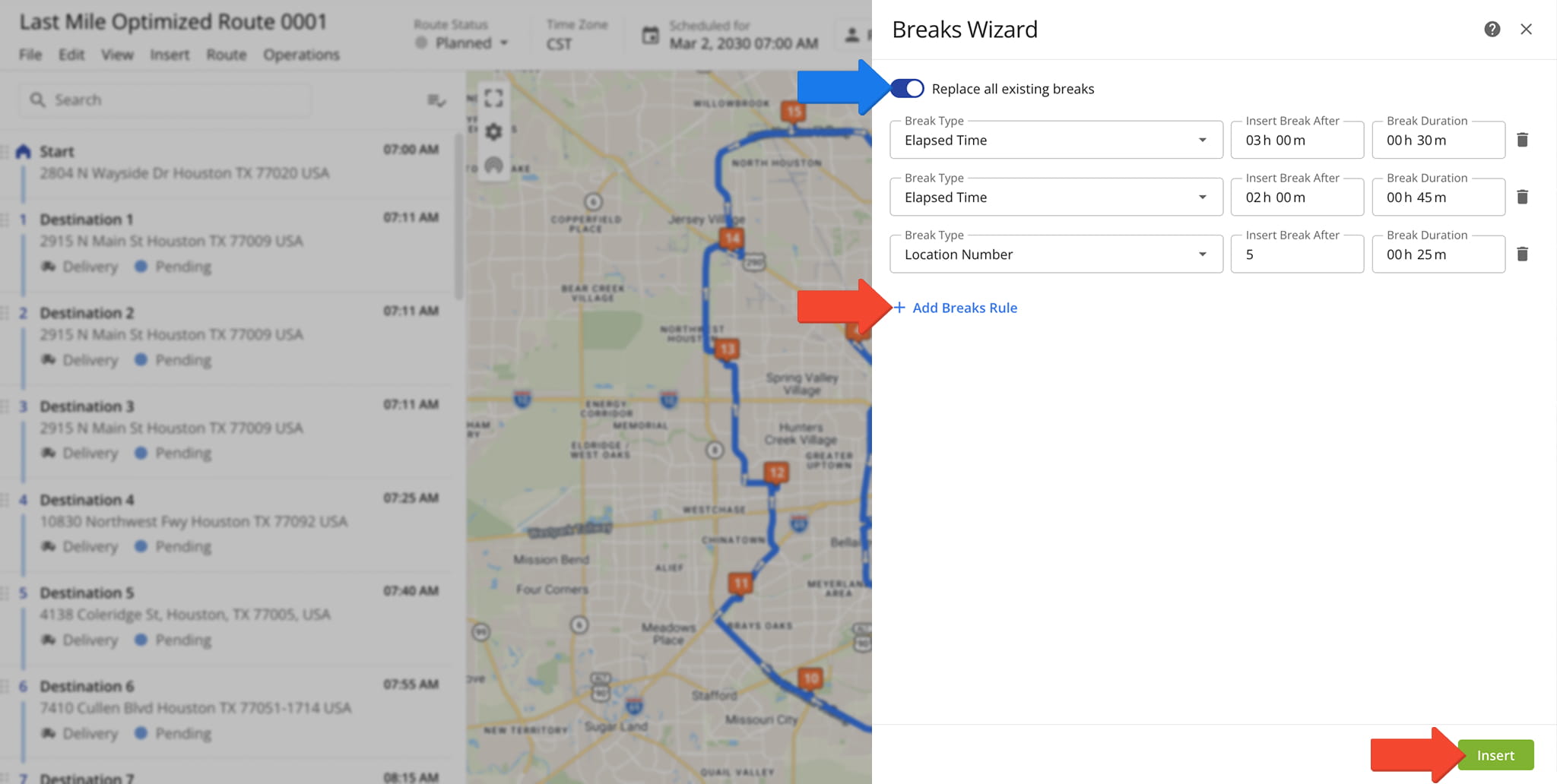 In the “Breaks Wizard“, set the duration for each break and choose a Break Type with the desired interval. Click “Add Break Rule” to create additional breaks, then click “Insert” to apply all breaks to the selected routes.
