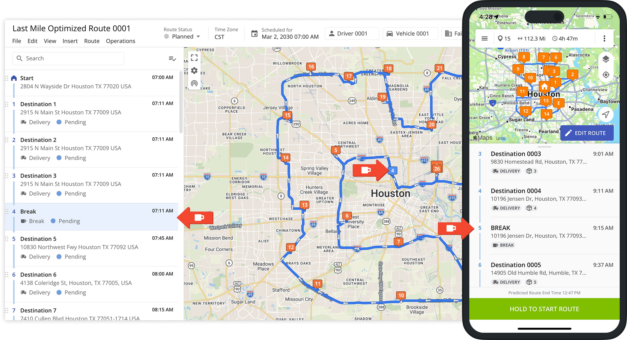 After assignment, the route appears in the driver’s account in real time, allowing them to start, navigate, and complete it. Driver Breaks are labeled “Break” in both the Route Editor and the Mobile Apps.