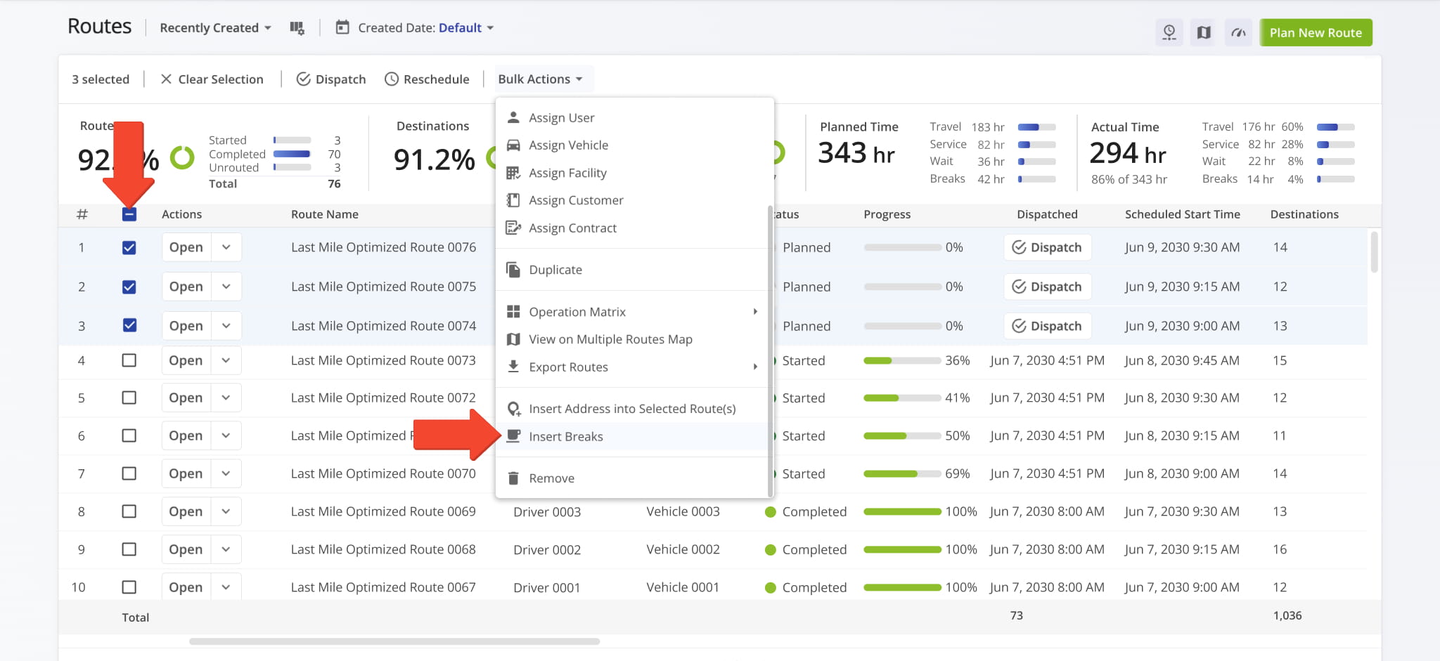To insert breaks from the Routes List, first select your preferred planned routes by checking the boxes next to them. Then, click “Bulk Actions” > “Insert Breaks” from the menu.
