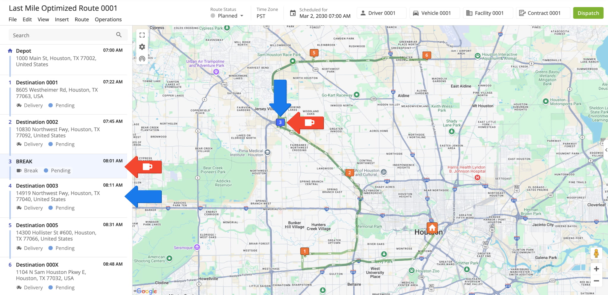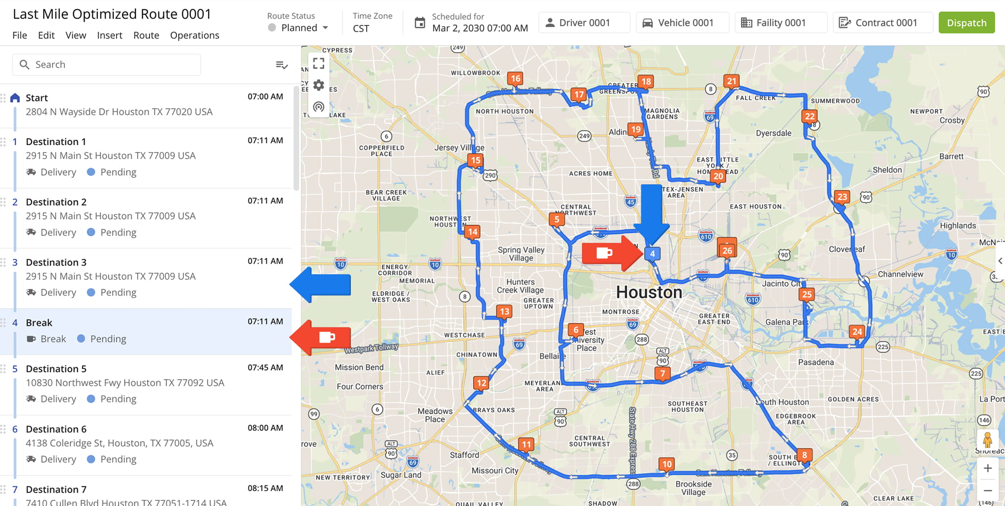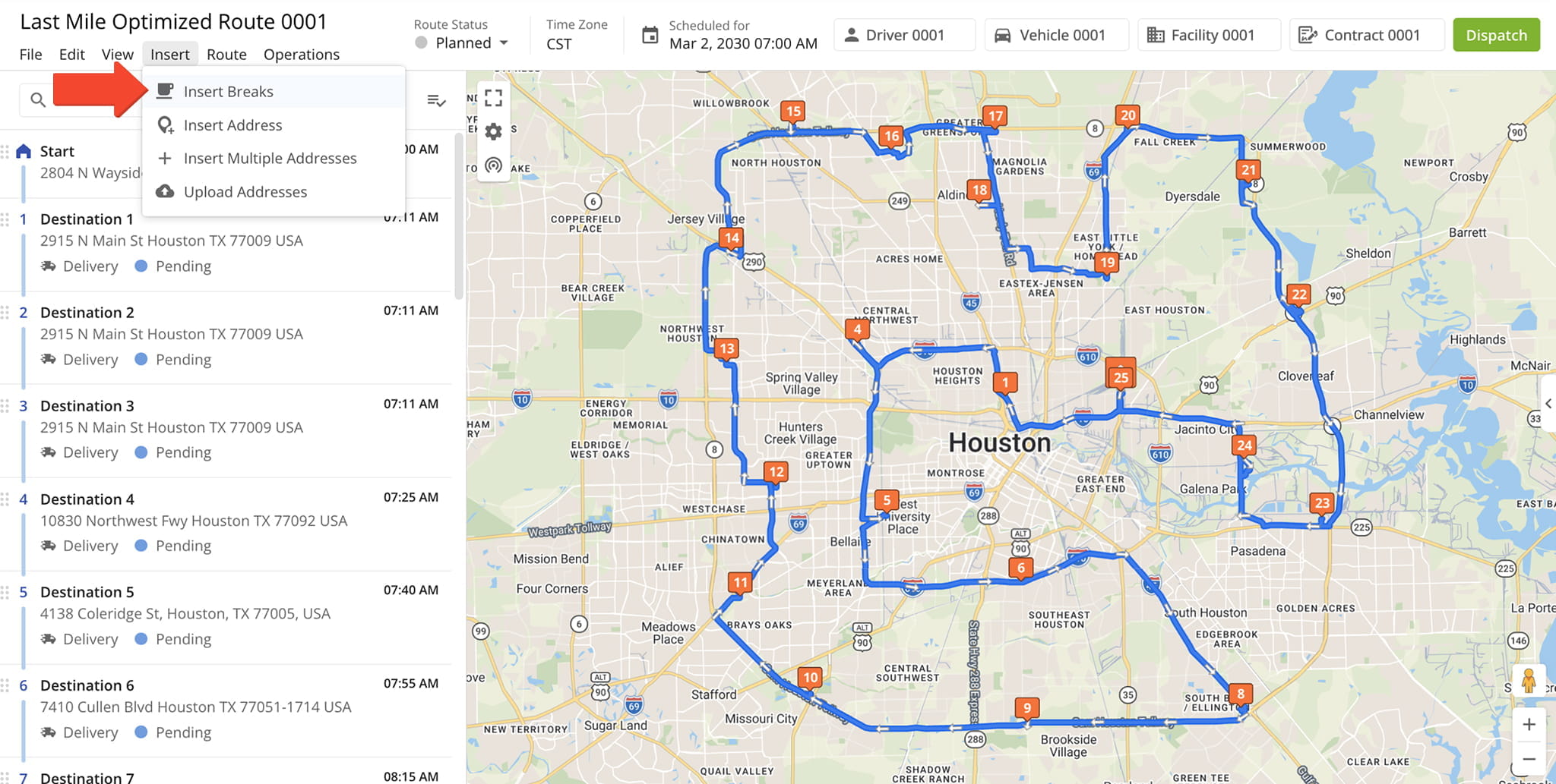 Each Driver Break is added as an additional destination at the same address as the destination visited immediately before the break. This placement ensures route and driver efficiency without altering the sequence of stops.