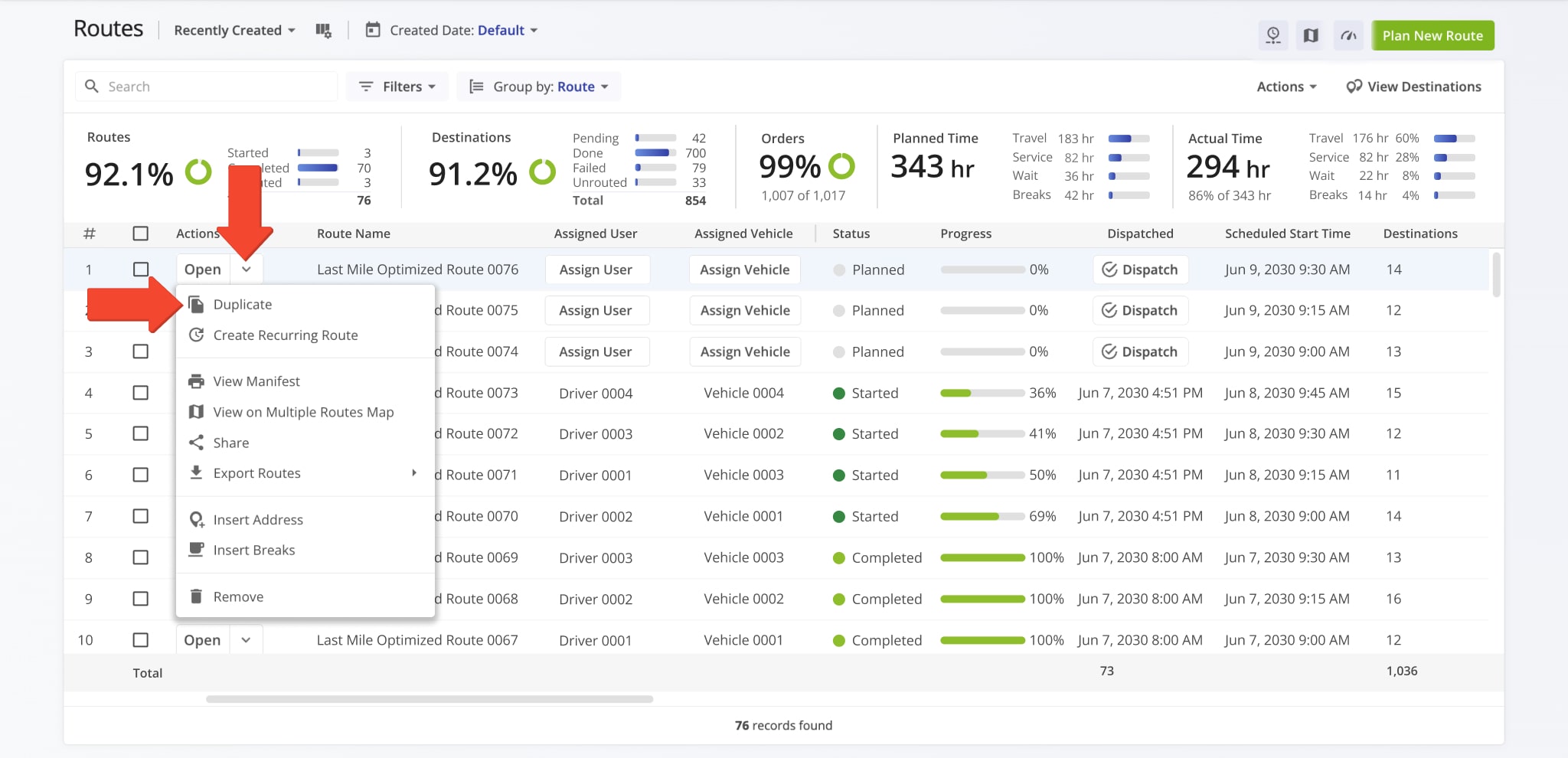 To duplicate multiple routes at once, select the checkboxes next to the routes in your Routes List. Then, click “Bulk Actions” in the top menu and select “Duplicate” from the Actions Menu.
