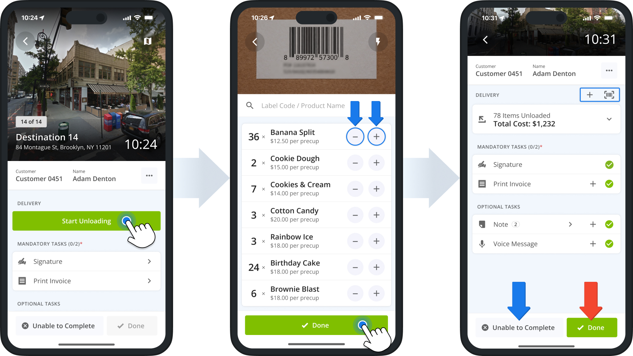 Complete any other mandatory POD tasks and tap “Done” button to complete the delivery. In case you need to adjust item quantities or make other changes to delivery items, you can tap the Plus Icon or Scanner Icon above the item unload total.
