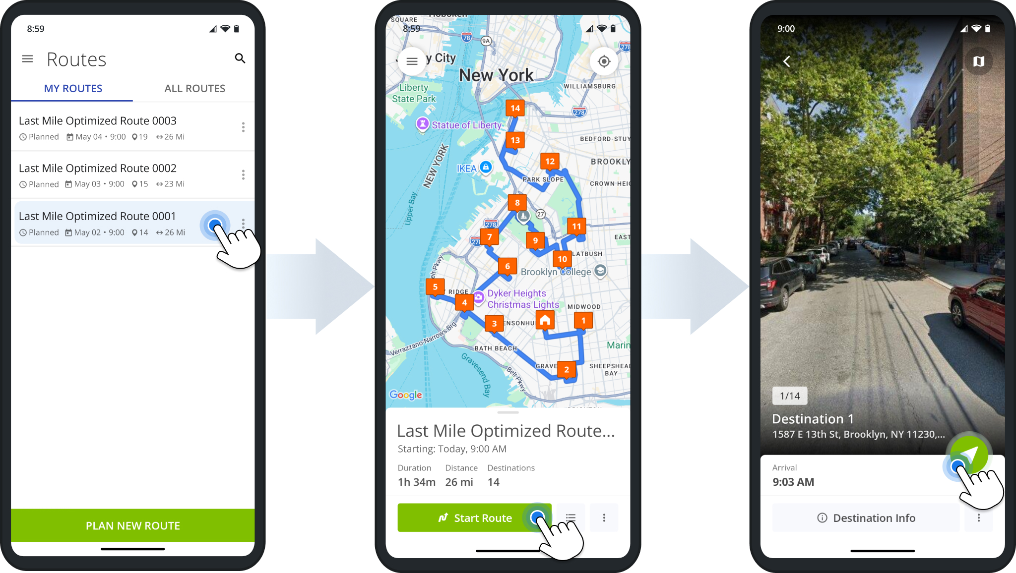 First, start a route as usual by selecting it from the Routes List and tapping “Start Route“. Then, navigate to destinations on the route by tapping the Navigate Button and following the in-app voice-guided GPS directions.