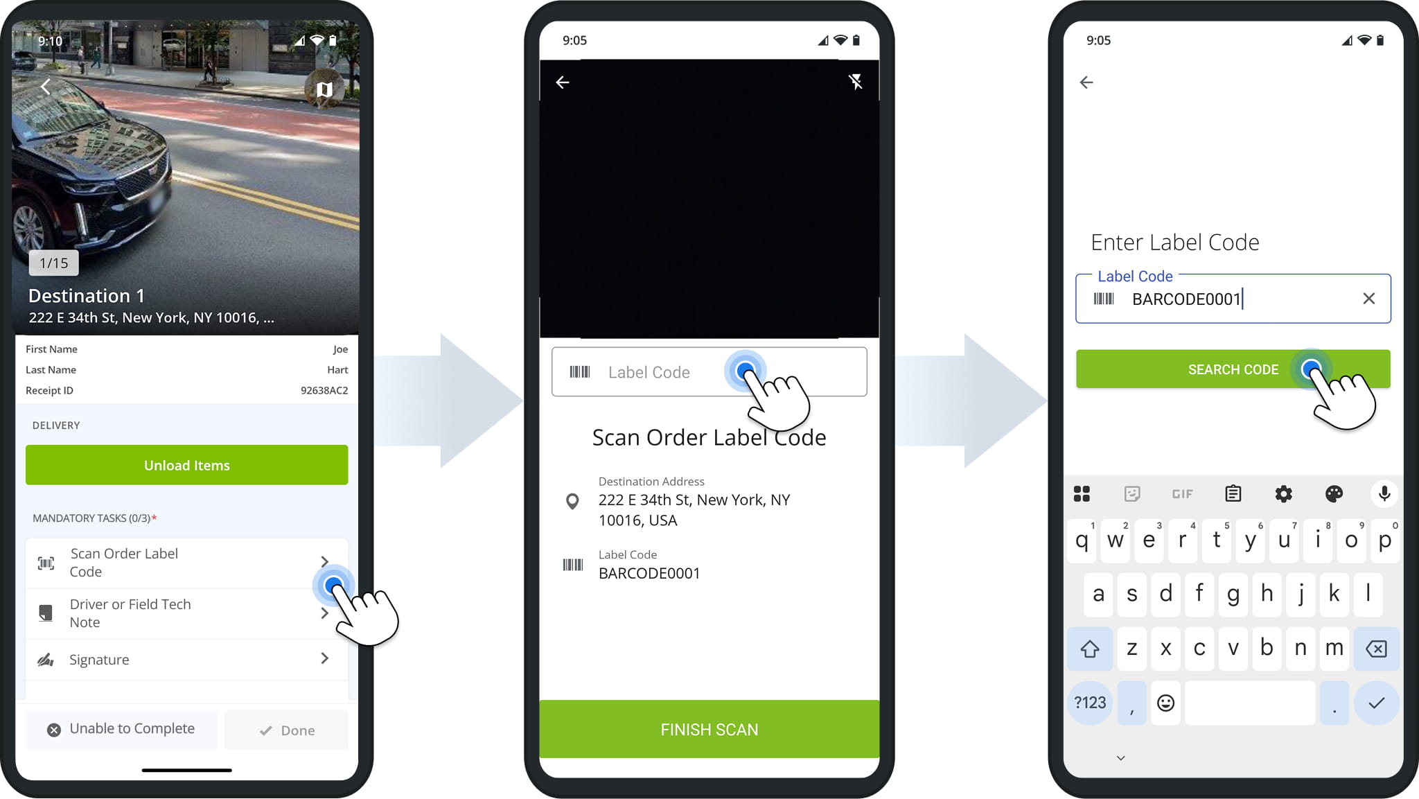 Tap the corresponding scanning task, scan the label code, and tap “Finish Scan“.