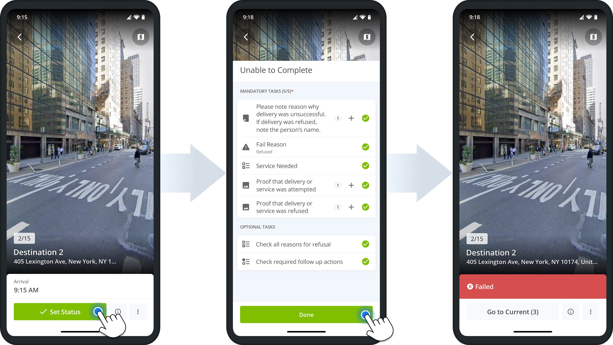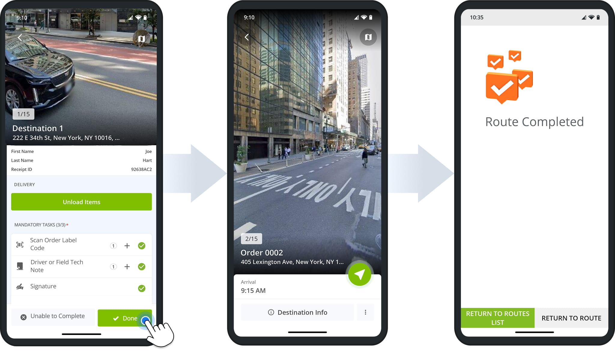 If an order can’t be unloaded at its address, mark the destination as “Unable to Complete“. Complete all mandatory and optional tasks, then tap”Done” to confirm.