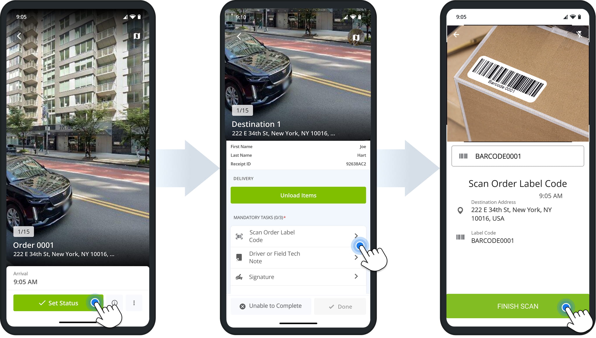 To unload an order after confirming you’ve arrived at a Destination, tap “Set Status“. Then, complete any required Mandatory Tasks. To confirm an order is delivered, you’ll usually have to have scan its respective barcode.