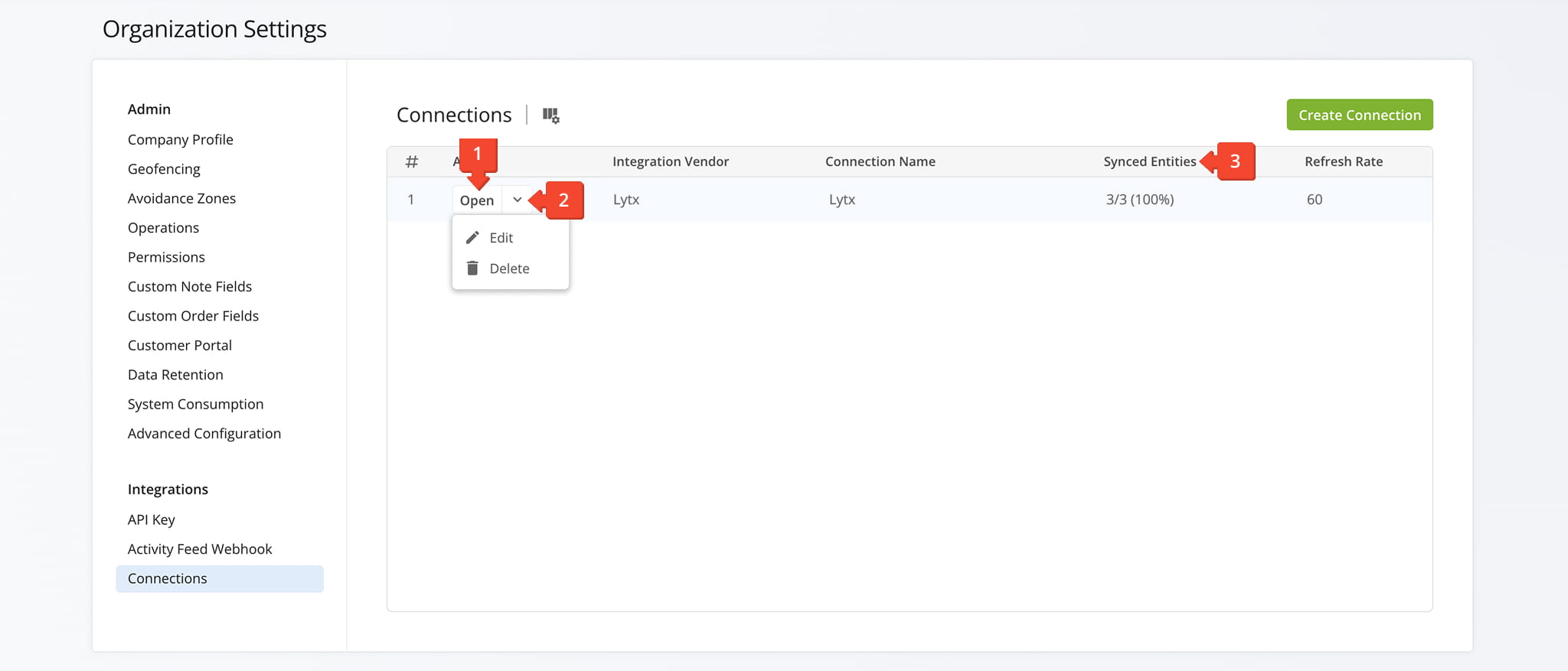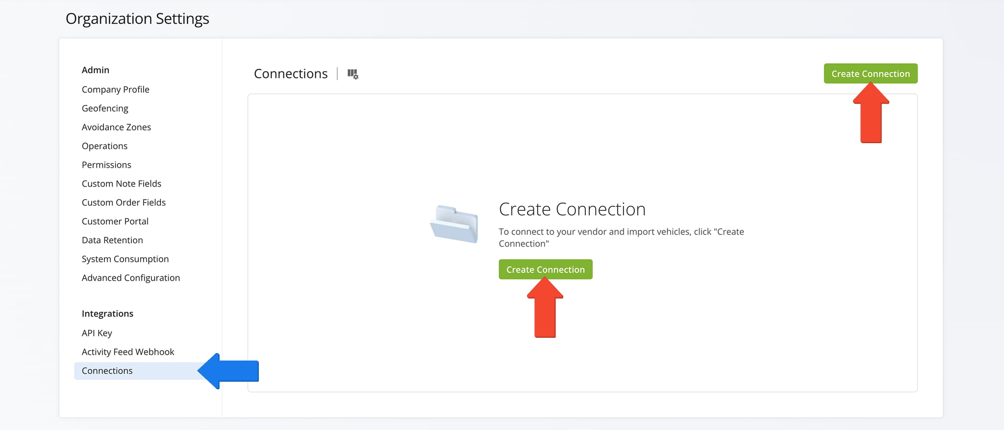 To establish a telematics connection and integrate Lytx, click “Settings” > “Organization Settings” in the Navigation Menu. Then, from your Account Settings page, click “Connections” > “Create Connection” button.
