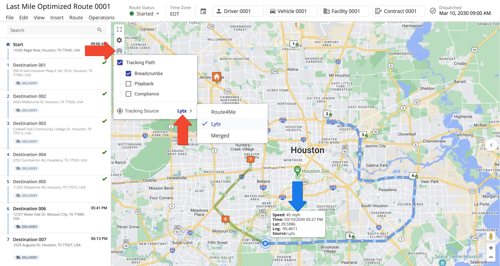 To track a vehicle on the map, click the tracking icon in the map’s upper left corner and check the “Tracking Path” box. Then, check “Breadcrumbs” and select as your “Tracking Source” Lytx. NOTE: Learn more about GPS tracking data.