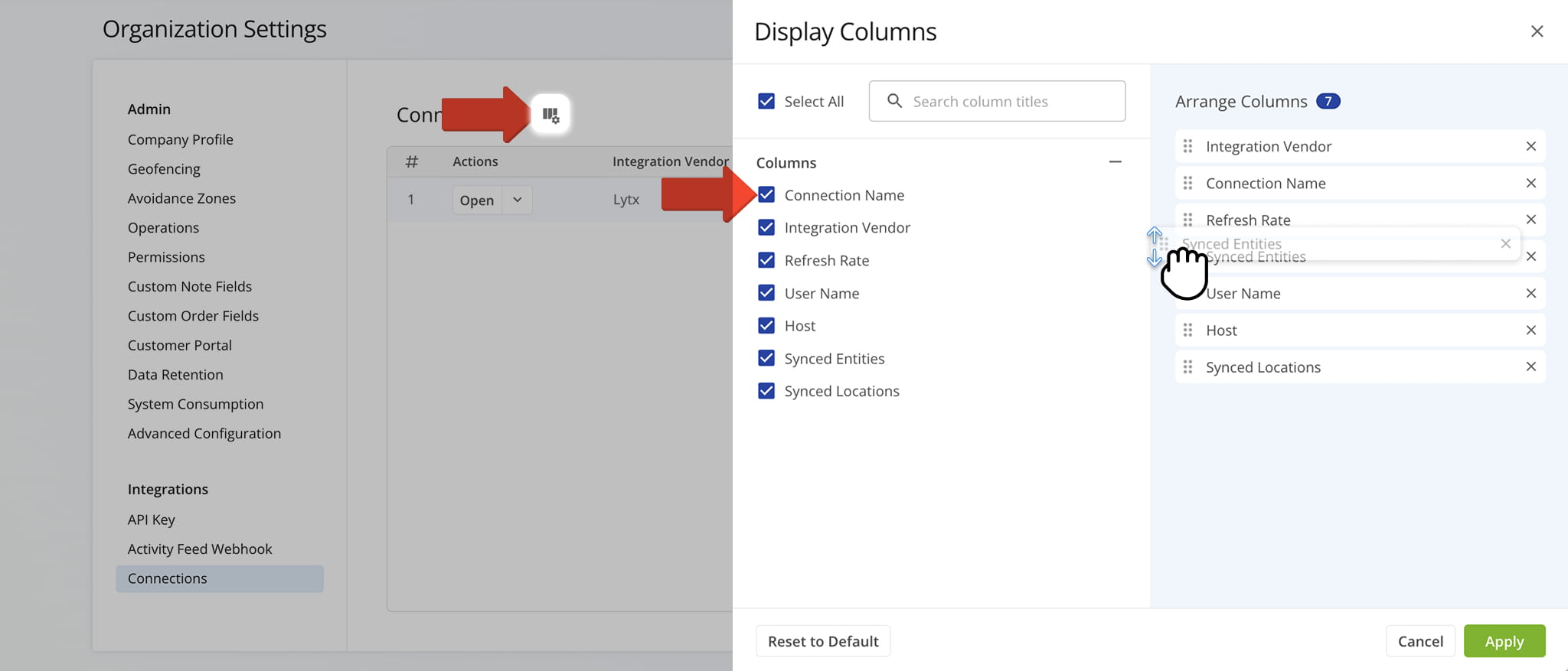 You can also customize the data displayed in the table. Click the Column Icon to select which telematic connection field appear and adjust the order to suit your operational needs.