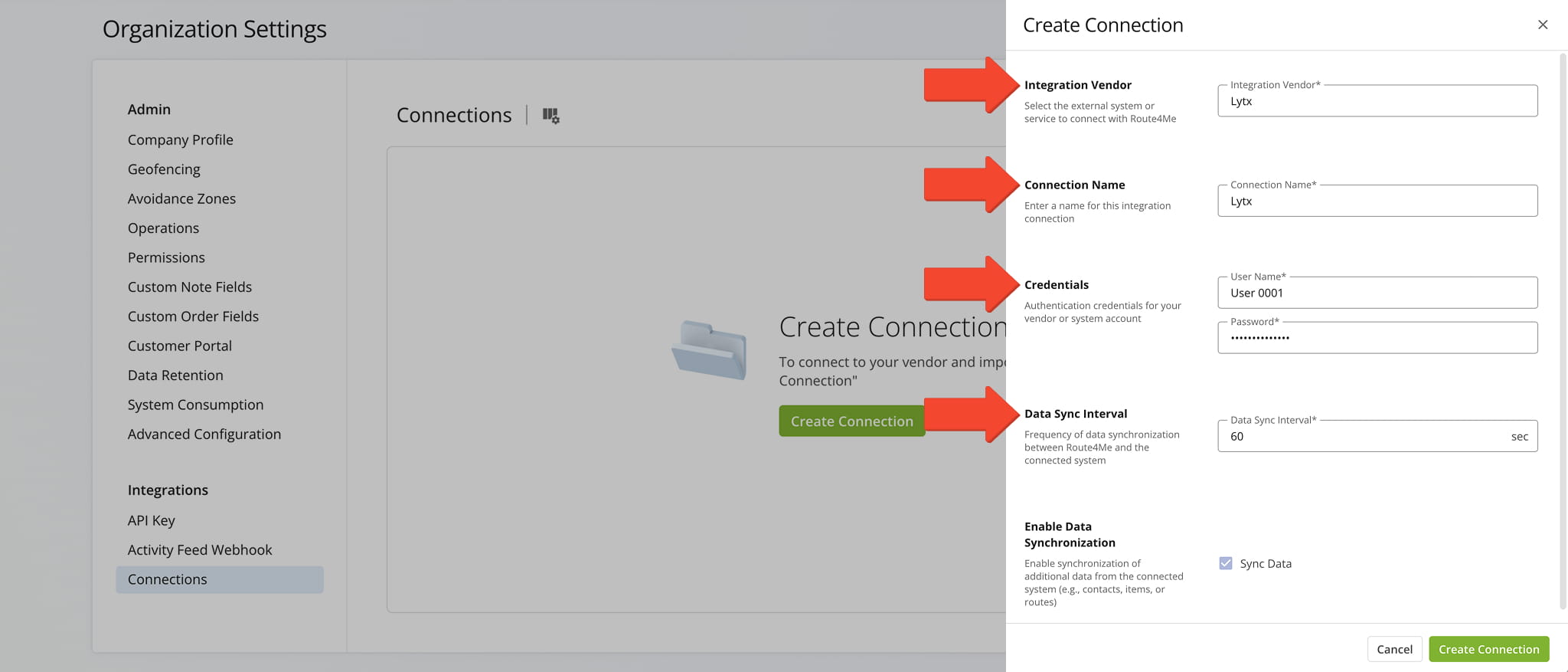 Select Lytx from the Integration Vendor drop down menu. Then, provide a connection name (for example, the name of the telematics vendor or product), and enter your credentials.