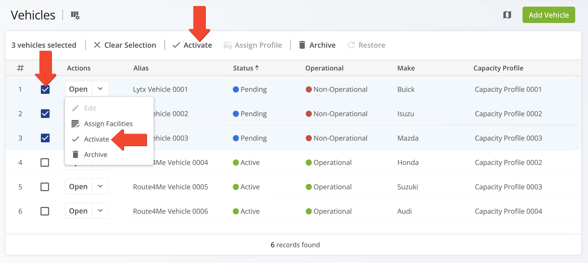 To enable multiple pending vehicles, check the box next to each and click the “Activate” button above the list. To enable a single pending vehicle, click the Down Arrow button next to it and select “Activate“.