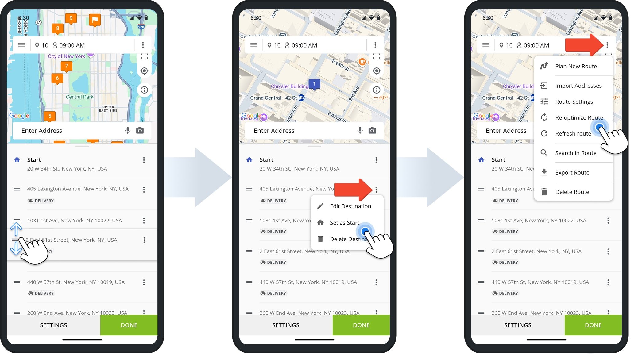 To re-sequence a stop, tap “Edit Route” from the menu. Then, tap on the stop you want to re-sequence and drag it into place. To make a stop the route’s new starting address, tap the Three-dot icon next to it and select “Set As Start“.