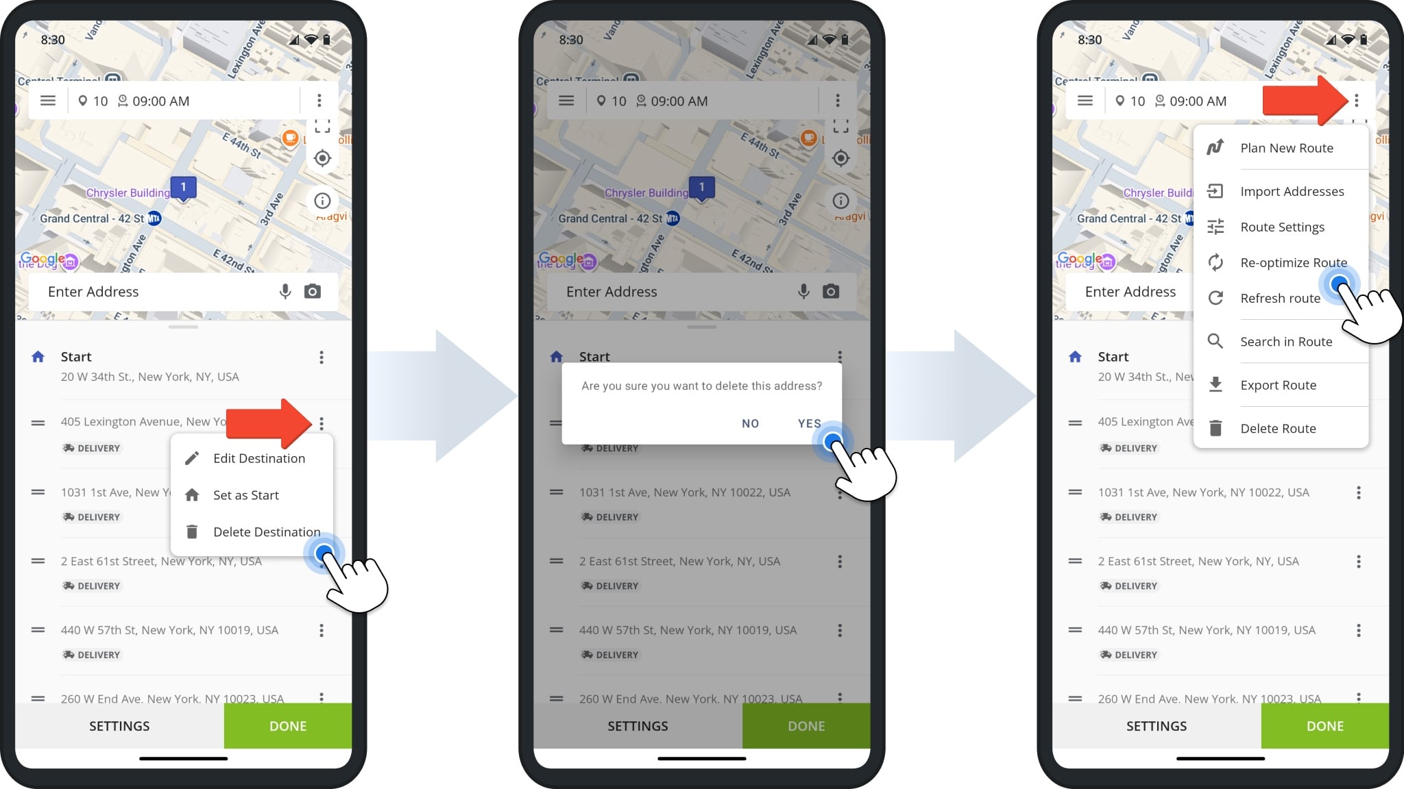 To delete a destination, tap “Edit Route” from the menu. Then, tap the Three-dot Icon next to the destination and select “Delete Destination“. When prompted, confirm by tapping “Yes“.
