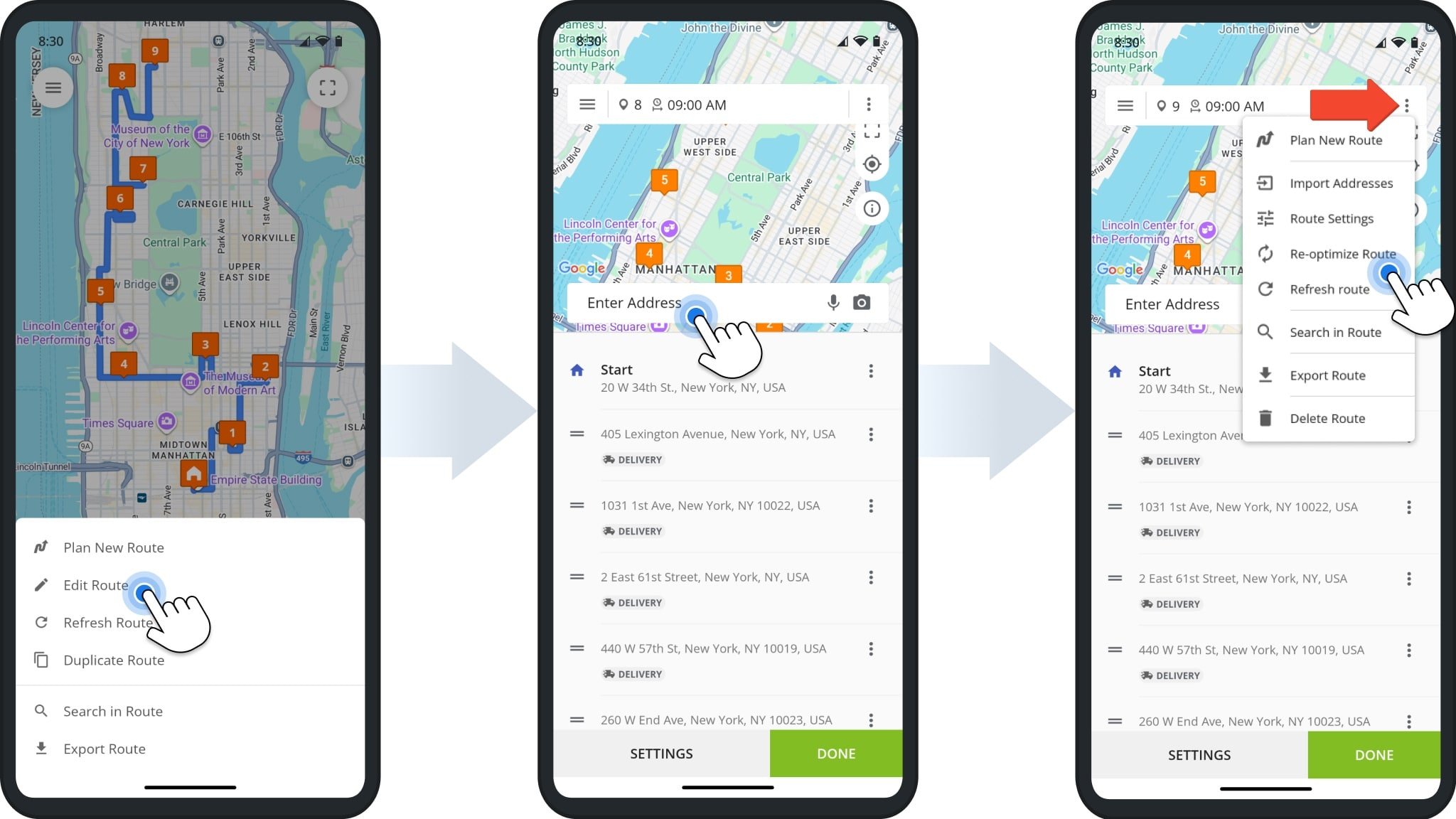 After making any route sequence changes, tap the Three-dot Icon at the top of the screen and select “Re-optimize Route“. This will ensure the updated sequence produces the most efficient route.