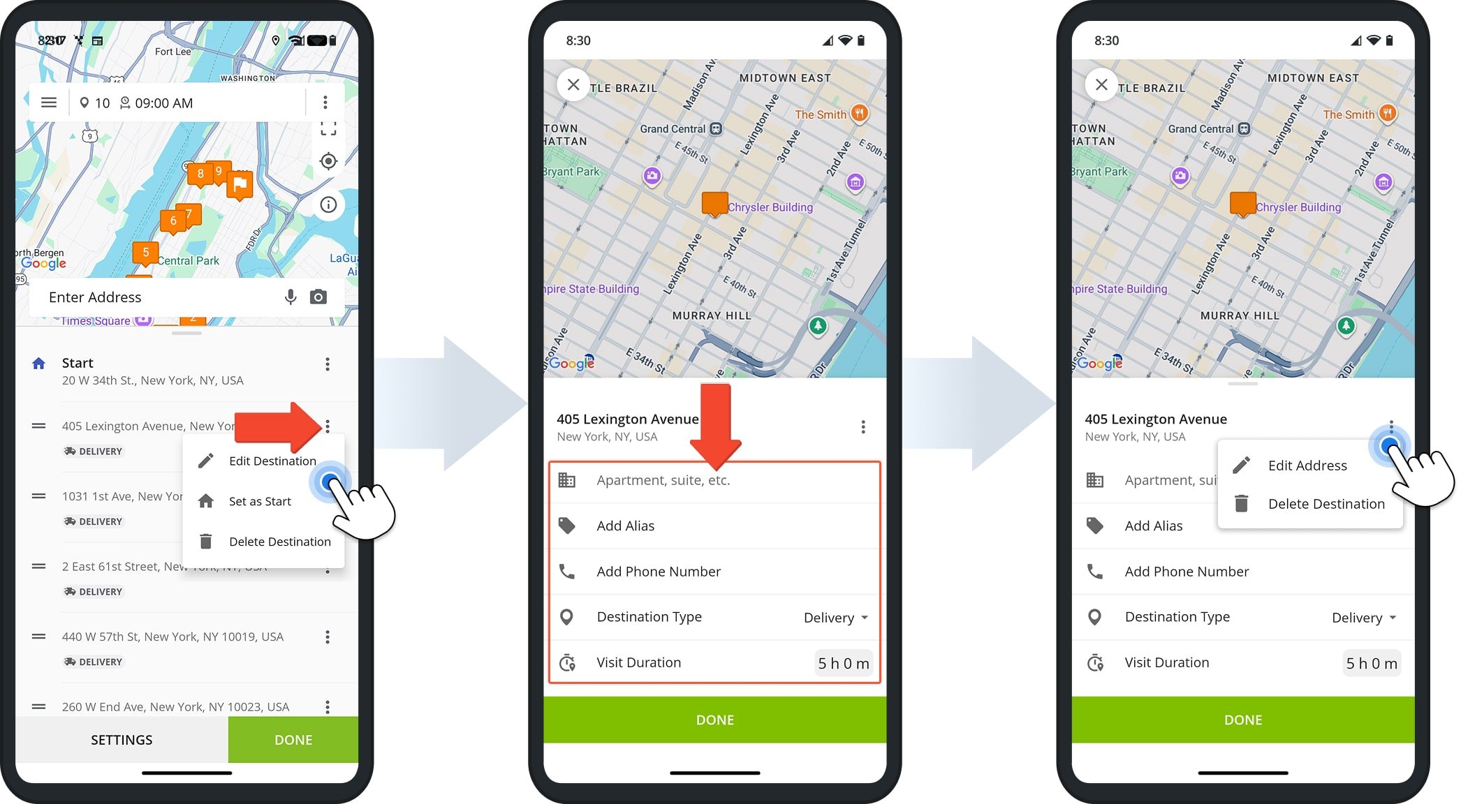 From the Destination Overview page, you can update the address, Alias, phone number, destination type, and visit duration. You can also tap the Three-dot Icon next to the address to edit or delete it.
