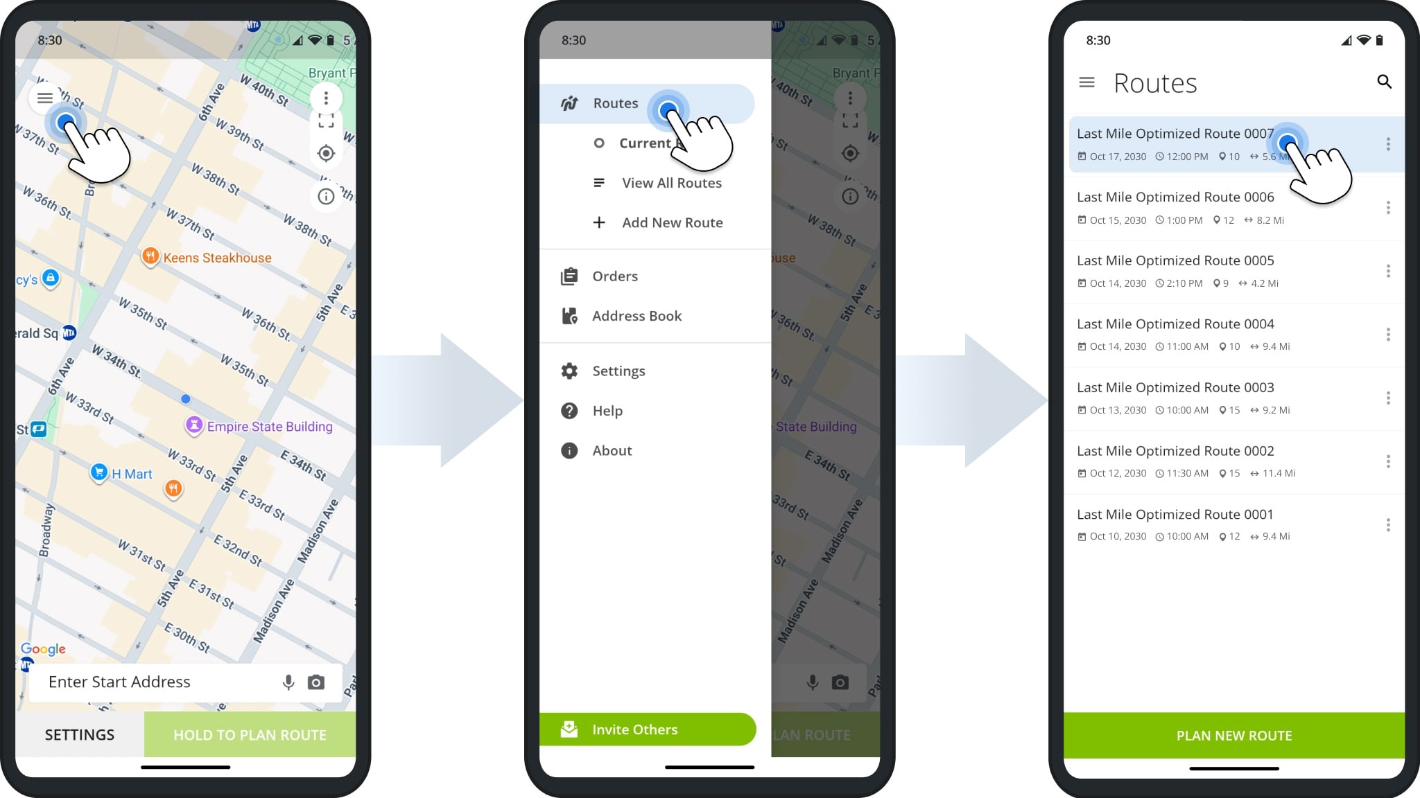 After signing in to Route4Me’s mobile route planner app for iOS or Android, tap the Menu Button in the top-left corner. Then, tap “Routes” to open your Routes List. Here, you’ll find all of your planned, dispatched, and active routes.