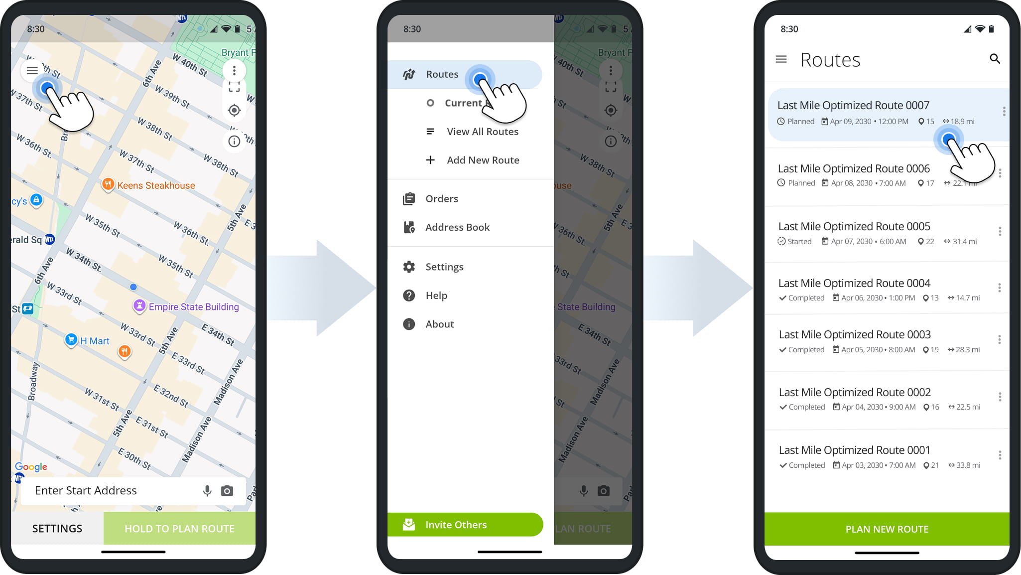 After signing in to Route4Me’s mobile route planner app, tap the Menu Button in the top-left corner. Then, tap “Routes” to open your Routes List. Here, you’ll find all of your planned, dispatched, and active routes.