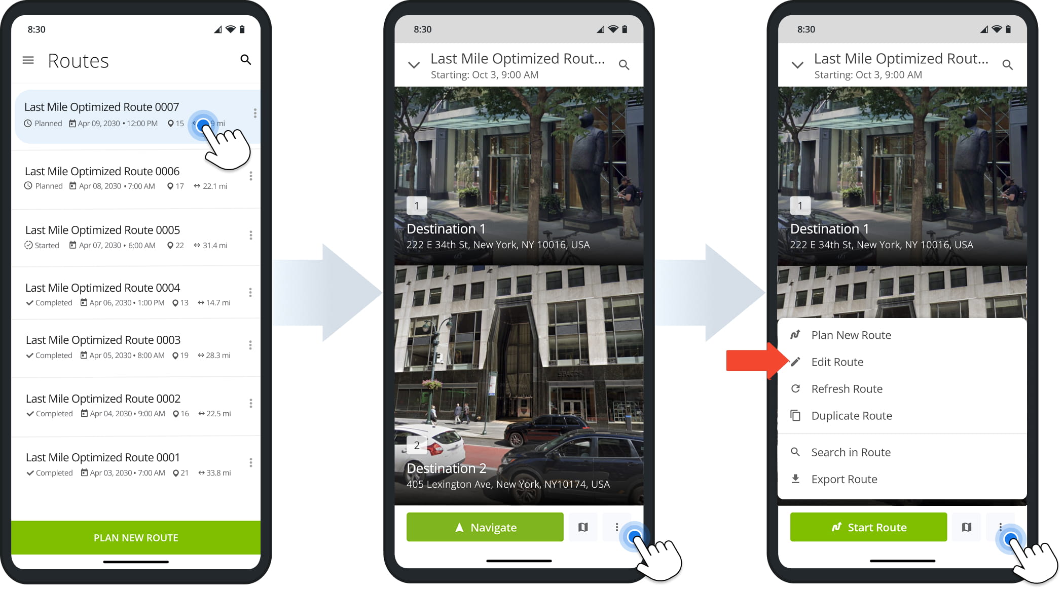 To re-sequence a stop, tap “Edit Route” from the menu. Then, tap on the stop you want to re-sequence and drag it into place. To make a stop the route’s new starting address, tap the Three-dot icon next to it and select “Set As Start“.